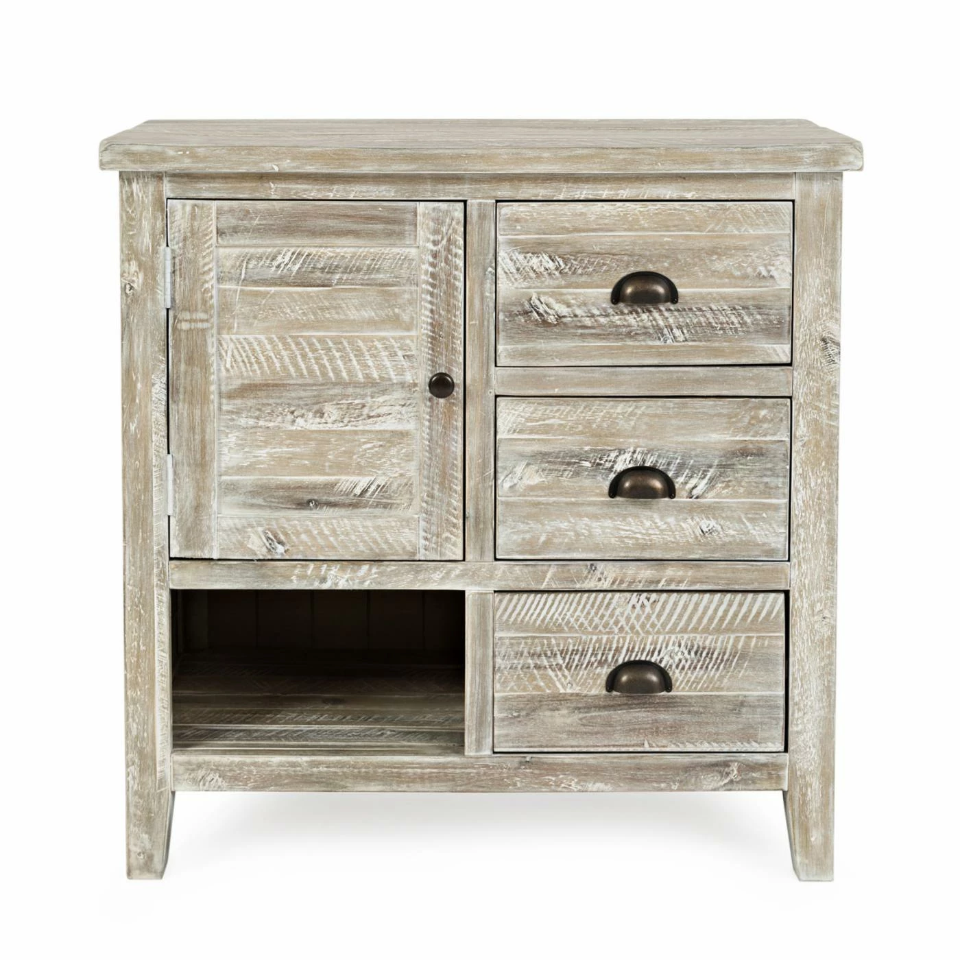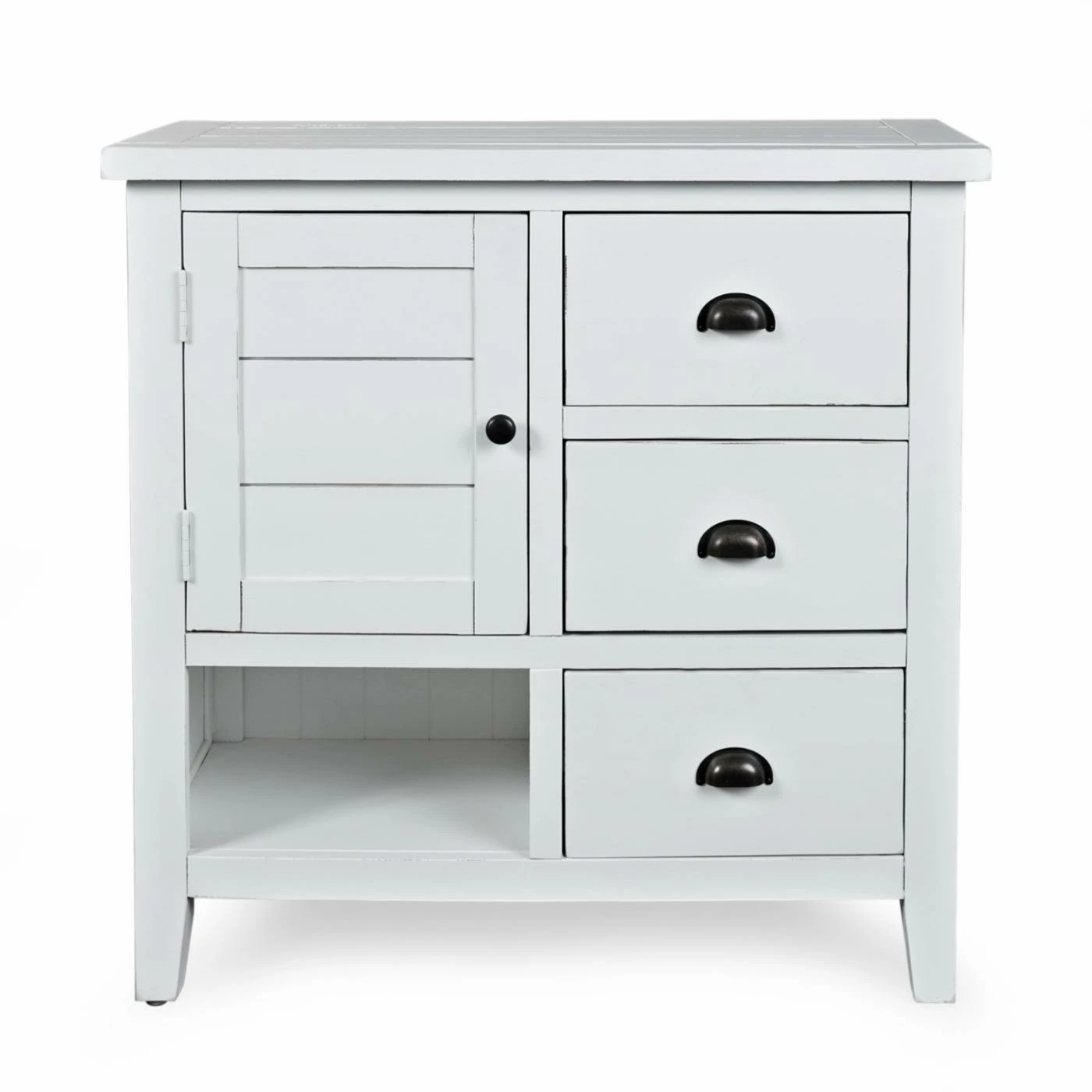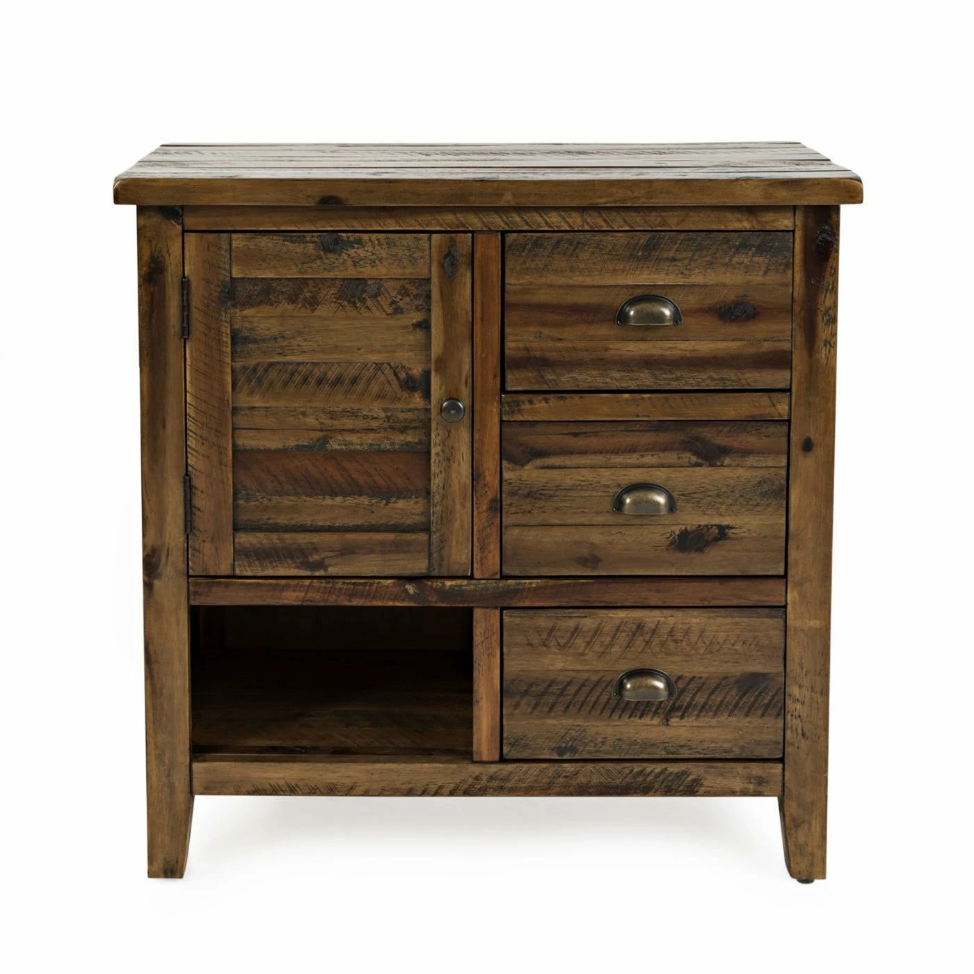 Thoughtful distressing, wood plank details, and metal cup pulls give the Jofran Artisans Craft Accent Chest its rugged appeal. This accent chest is scaled to fit neatly in a hallway, entry, or any room needing storage and a splash of rustic charm. It boasts a single door, an open shelf, and three drawers for abundant storage.