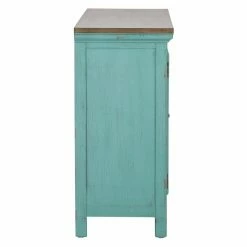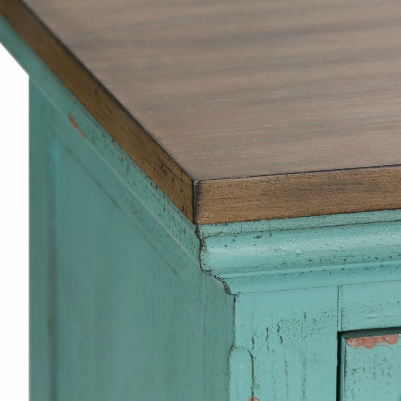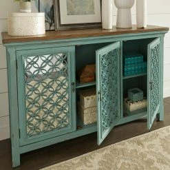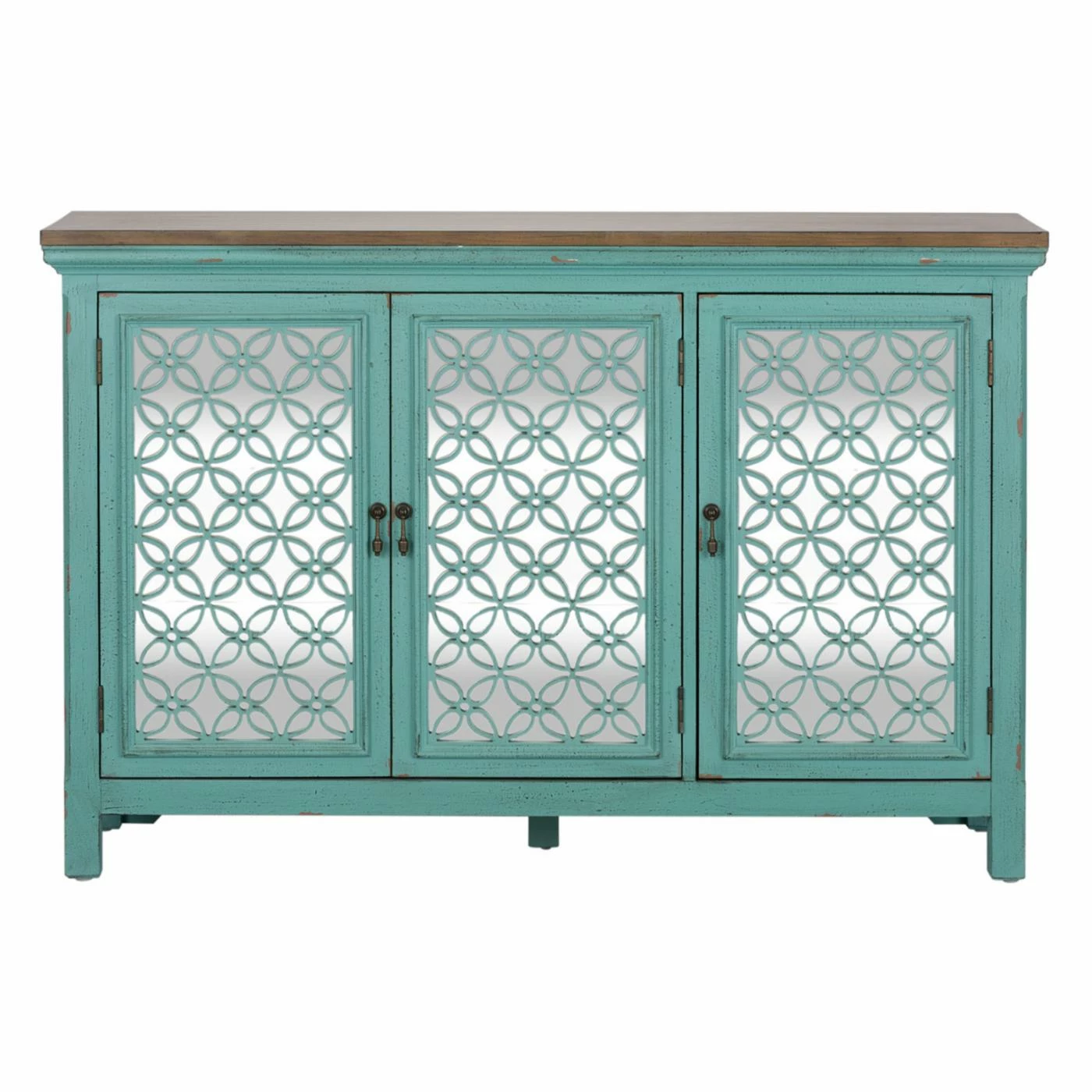 Provide a refreshing touch of weathered coastal charm with the Liberty Furniture Industries Kensington 3 Door Accent Cabinet. This cabinet has a double-door cabinet and single-door cabinet, each with an interior shelf. Organize files, books, and more thanks to this expansive storage unit. It’s made of wood and comes finished in weathered turquoise blue with a deep brown finish on the top. Antique mirrors inset the doors, overlaid with a classic trellis pattern.