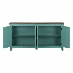 With potential as a sideboard, credenza, or media chest, the Liberty Furniture Industries Kensington 4 Door Accent Cabinet has a fetching traditional design. Its wide design features wood construction and block legs. A distressed turquoise blue finish adds vintage appeal and the overhanging top is finished in brown. Two double-door cabinets provide boundless storage, each featuring interior shelves. The doors come with a polished mirror backing, overlaid with a trellis pattern.
