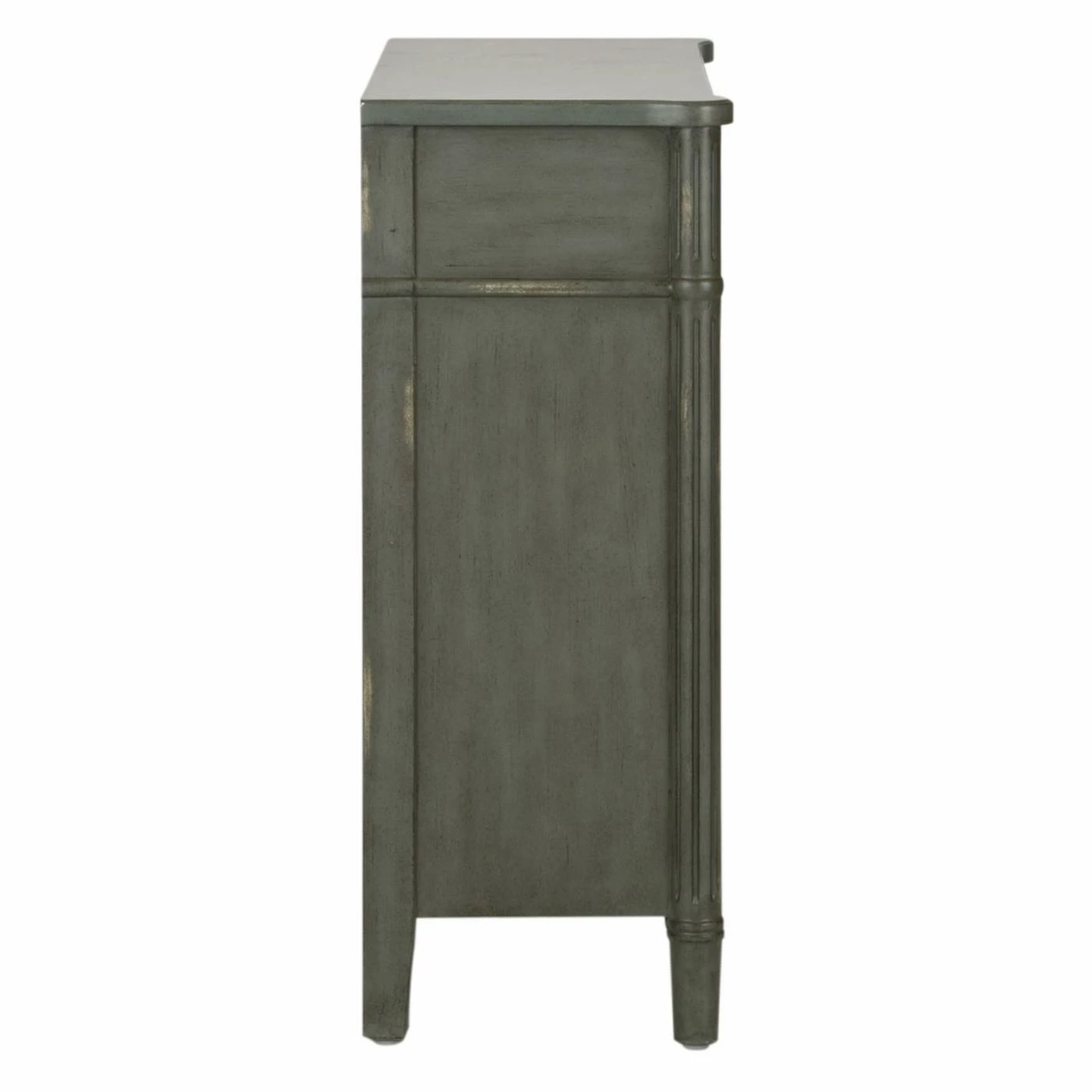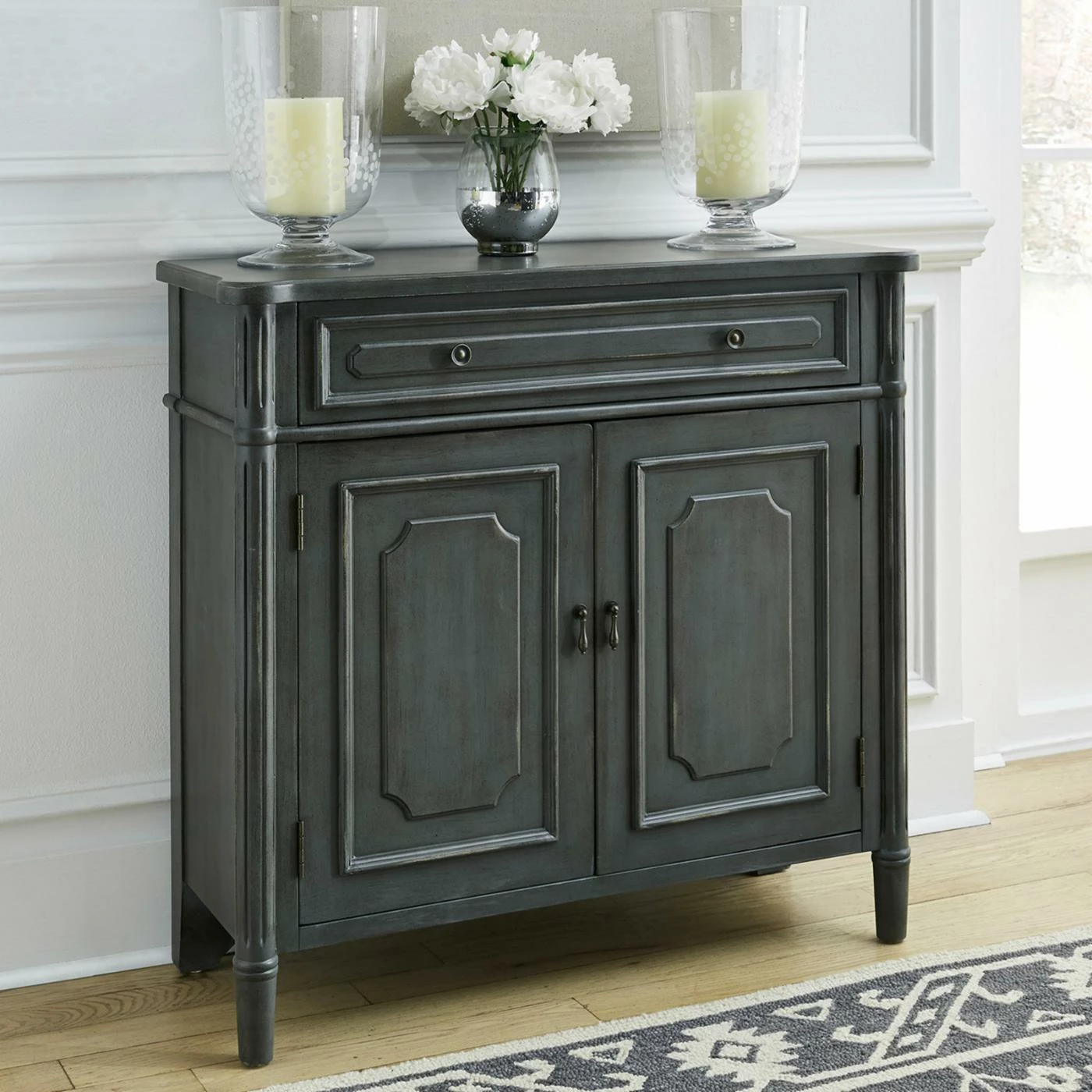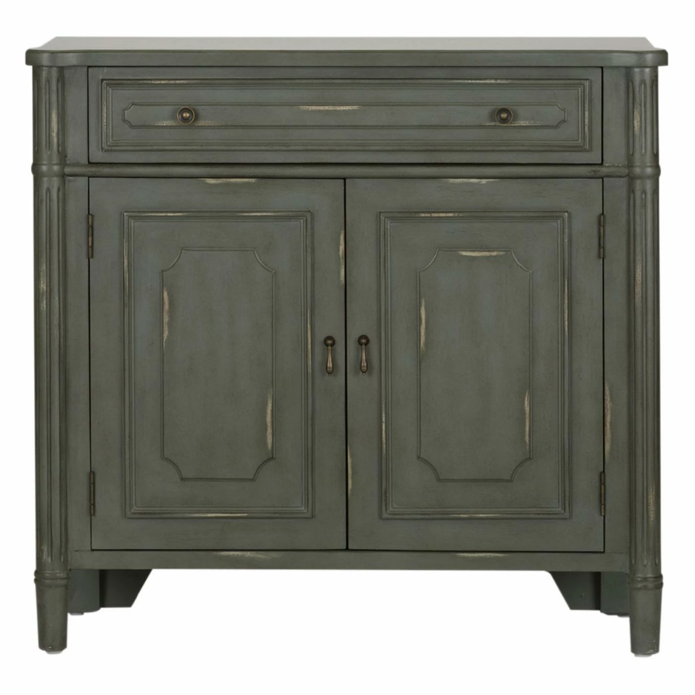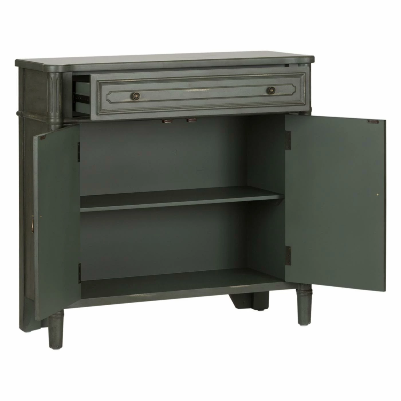 Expand your home’s functional storage space with the addition of the Liberty Furniture Industries Madison Park 1 Drawer 2 Door Accent Cabinet. This cabinet provides you with a spacious drawer and wide, double-door cabinet. An interior shelf keeps you neatly organized. Molded details and metal hardware accent the cabinet. The wood is finished in a cool gray with distressed white rub-through.