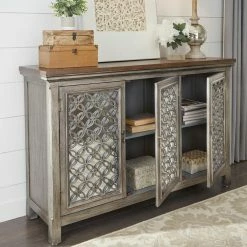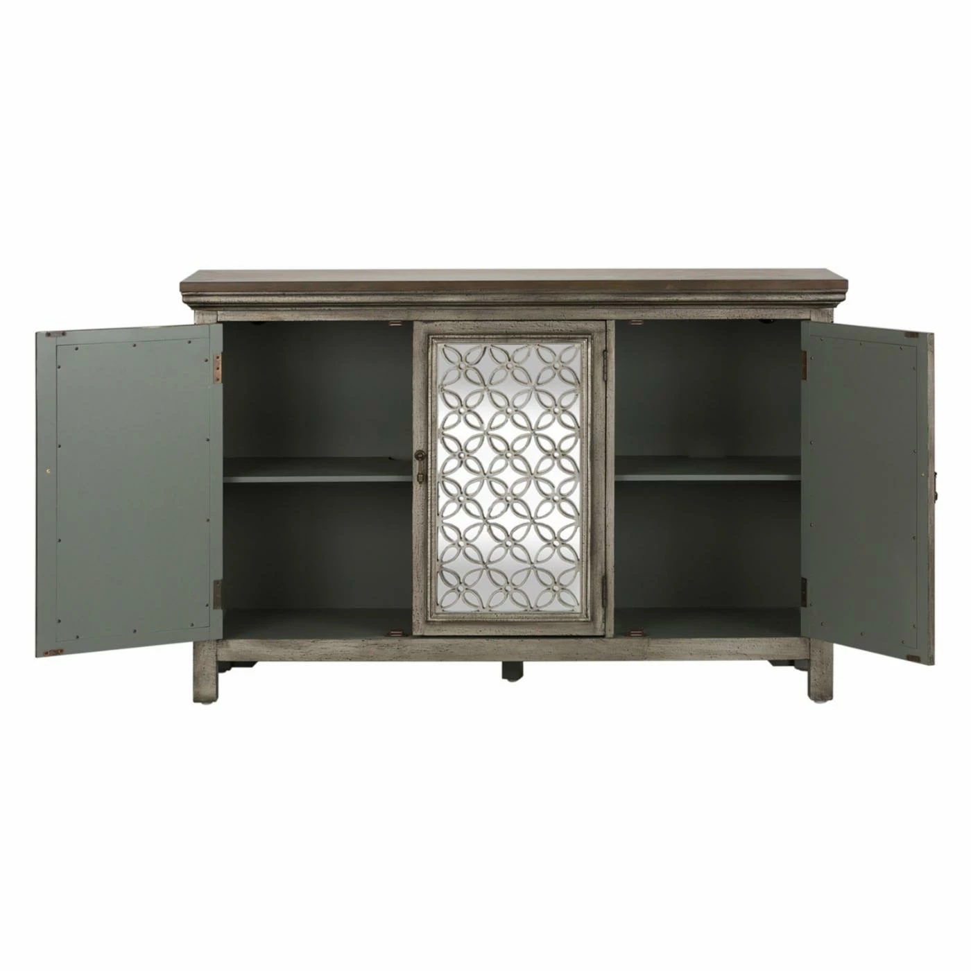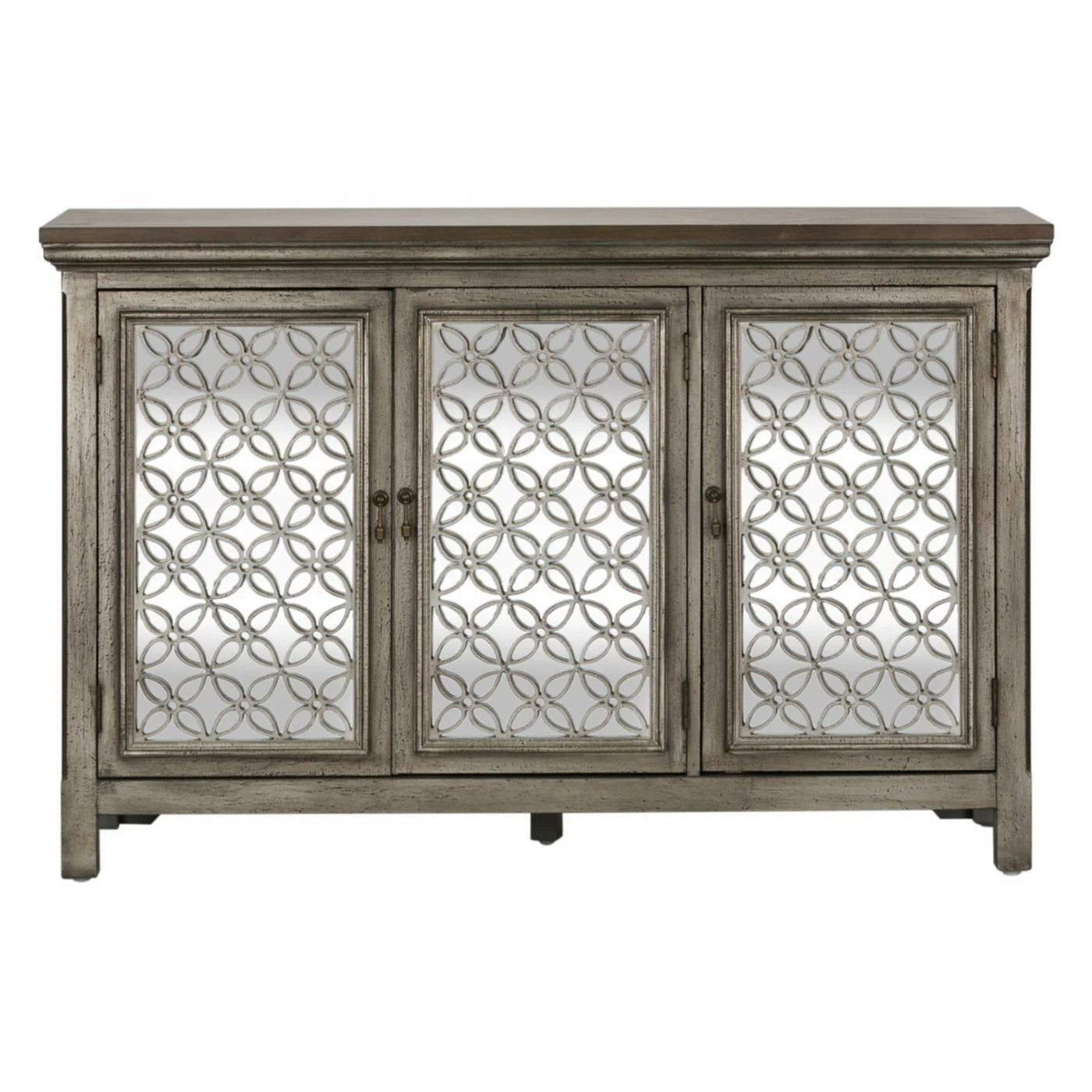 The Liberty Furniture Industries Westridge 3 Door Accent Cabinet makes a enchanting storage option for your den, living room, or bedroom. It’s made of durable hardwood with an overhanging top and perched on block legs. The accent cabinet is finished in gray with a wire-brush distressed texture for a weathered look. A single-door storage area and double-door storage area afford endless organizational space, each opening to reveal interior shelving. The doors are inset with mirrored panels and overlaid with a timeless trellis design.