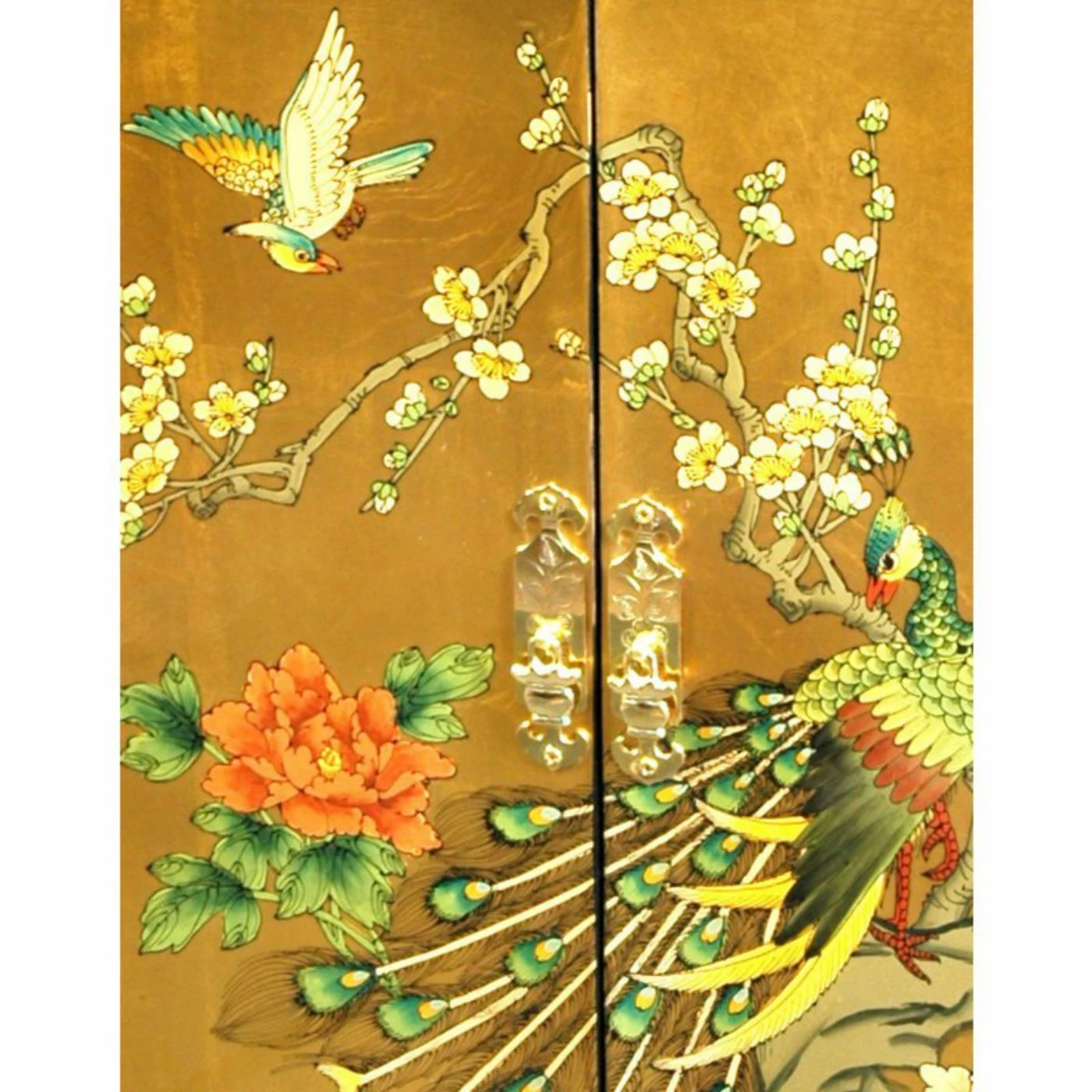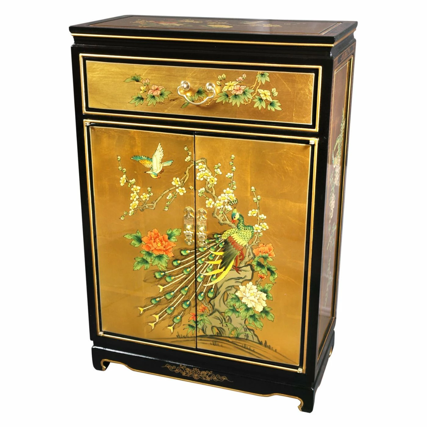 Inject elegance into your space with the Oriental Furniture Gold Leaf Decorative Chest. It boasts lovely hand-painted floral and bird designs on an authentic gold leaf background. The black finish forms an eye-catching contrast and creates a lovely border that enhances the look. Plus, the chest has brass hardware, and it’s lacquered to resist tarnishing. With this chest, you’ll enjoy a truly unique look. Since each piece is hand-crafted by skilled artisans, no two are exactly the same.