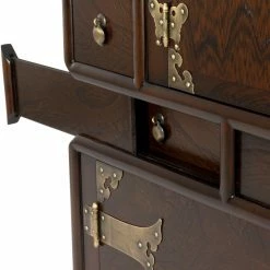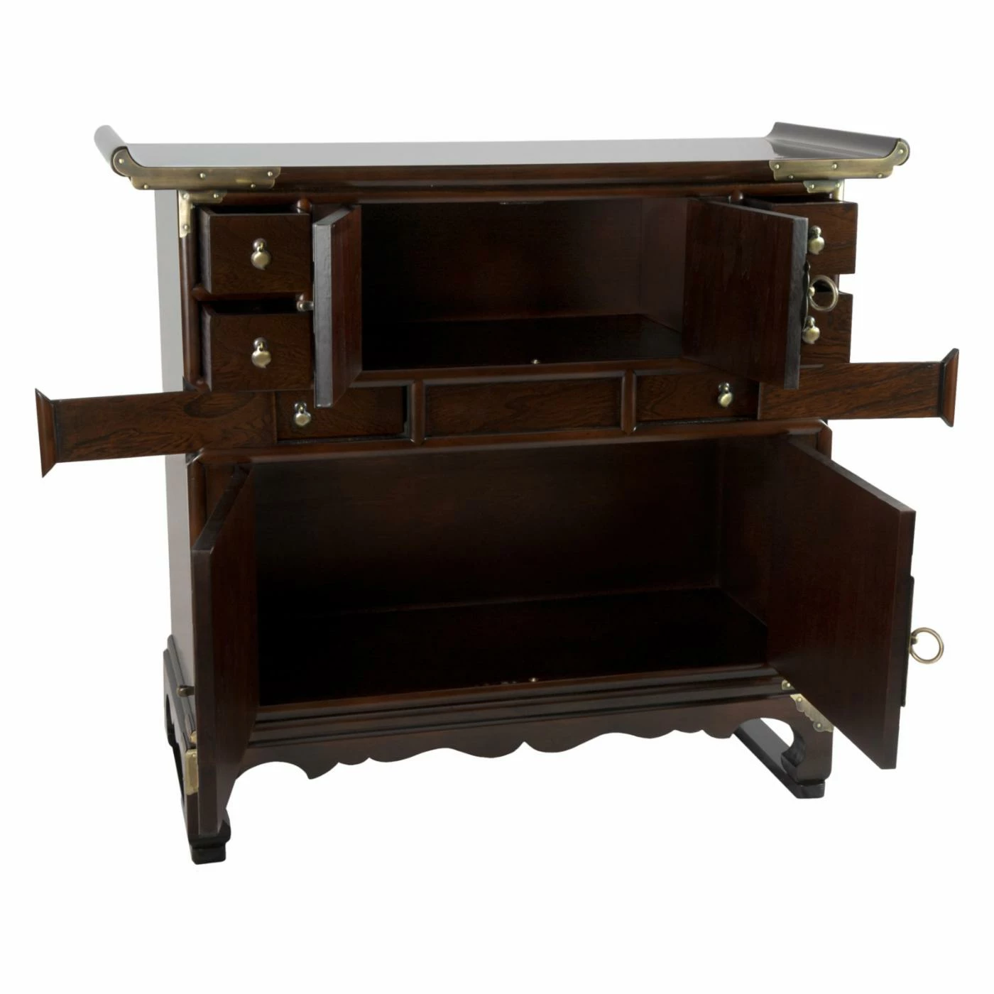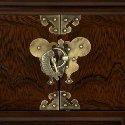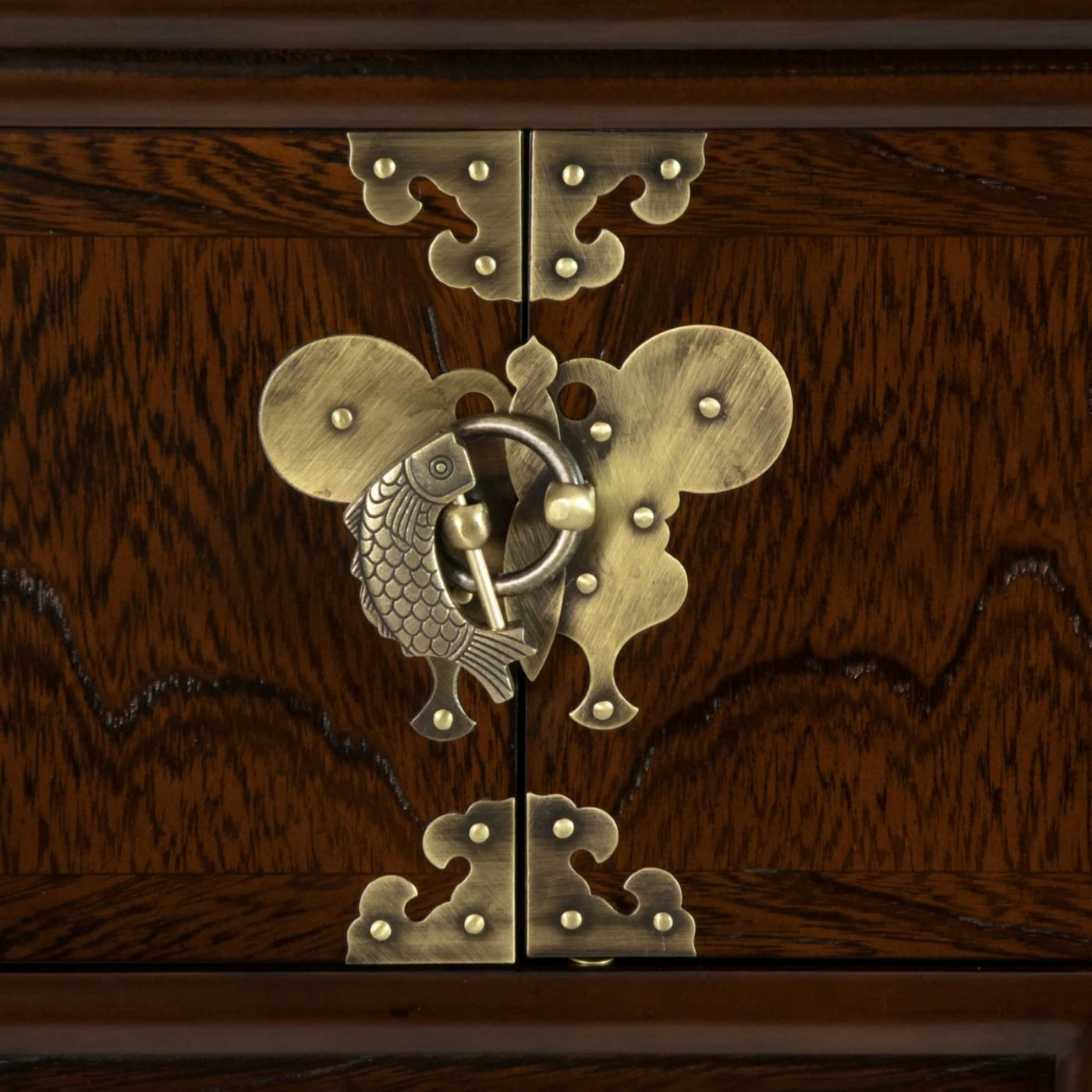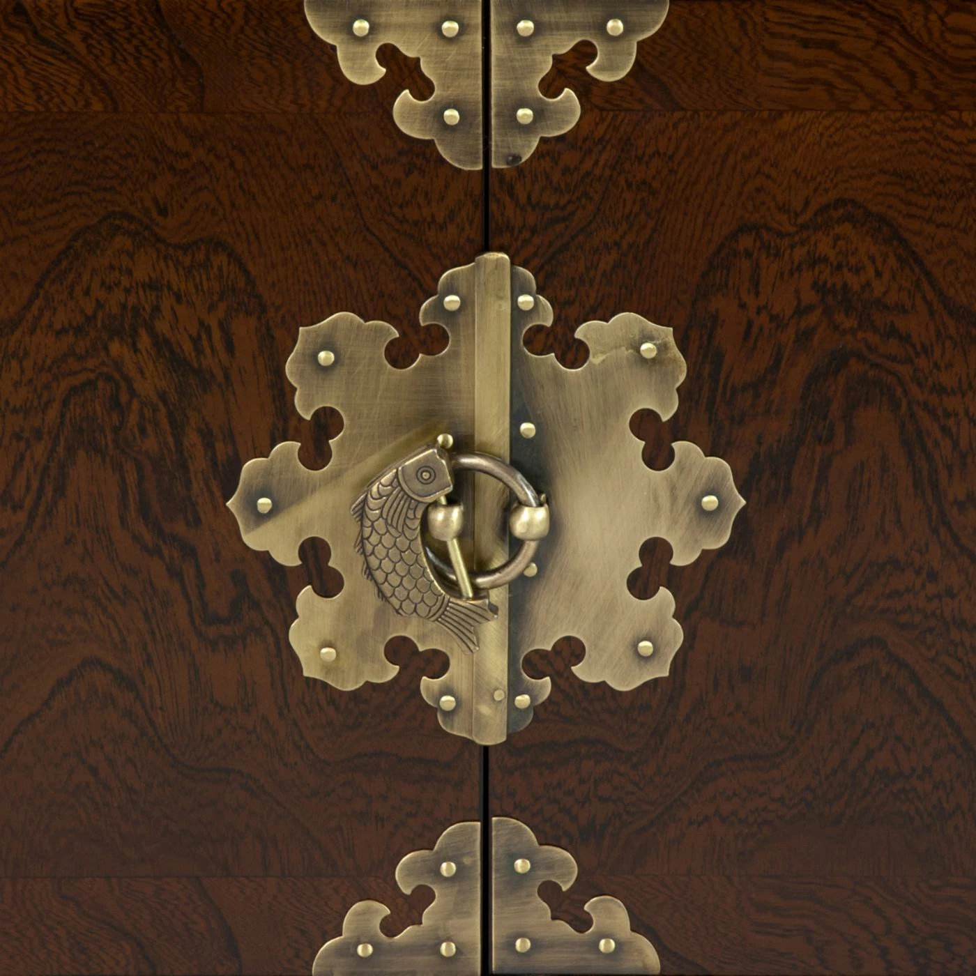 Two brass fish locks and keys plus butterfly hinges ensure this Oriental Furniture Korean Double Cabinet Decorative Chest will double your luck. This modern day heirloom chest is crafted of richly grained elm wood in a hand-rubbed dark stain. Its impressive storage includes hand-crafted drawers and cabinets embellished with Oriental style polished brass hardware. Traditional Oriental details include a tori style cantilevered top with upturned ends and Asian-inspired legs, all with brass-finished corner brackets.