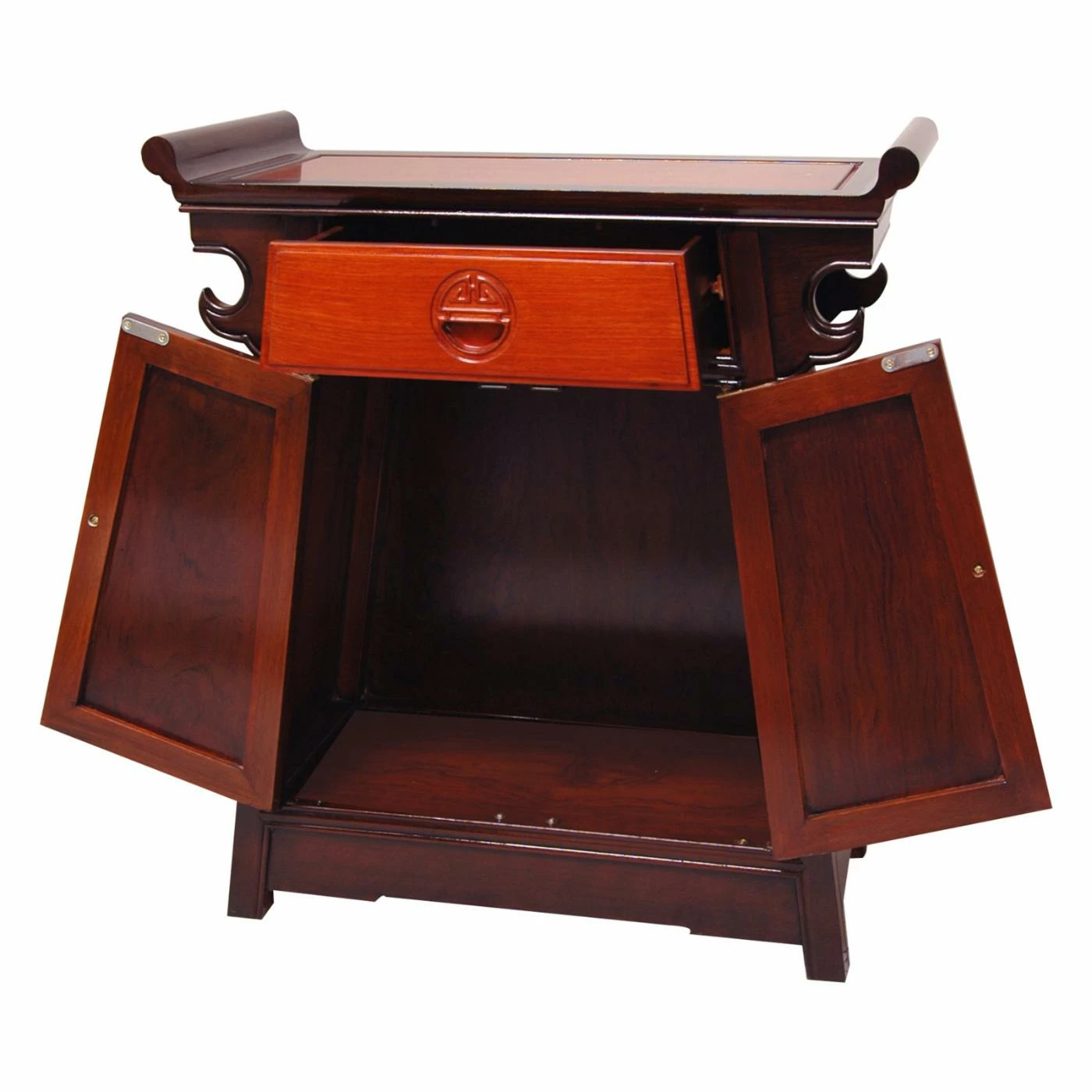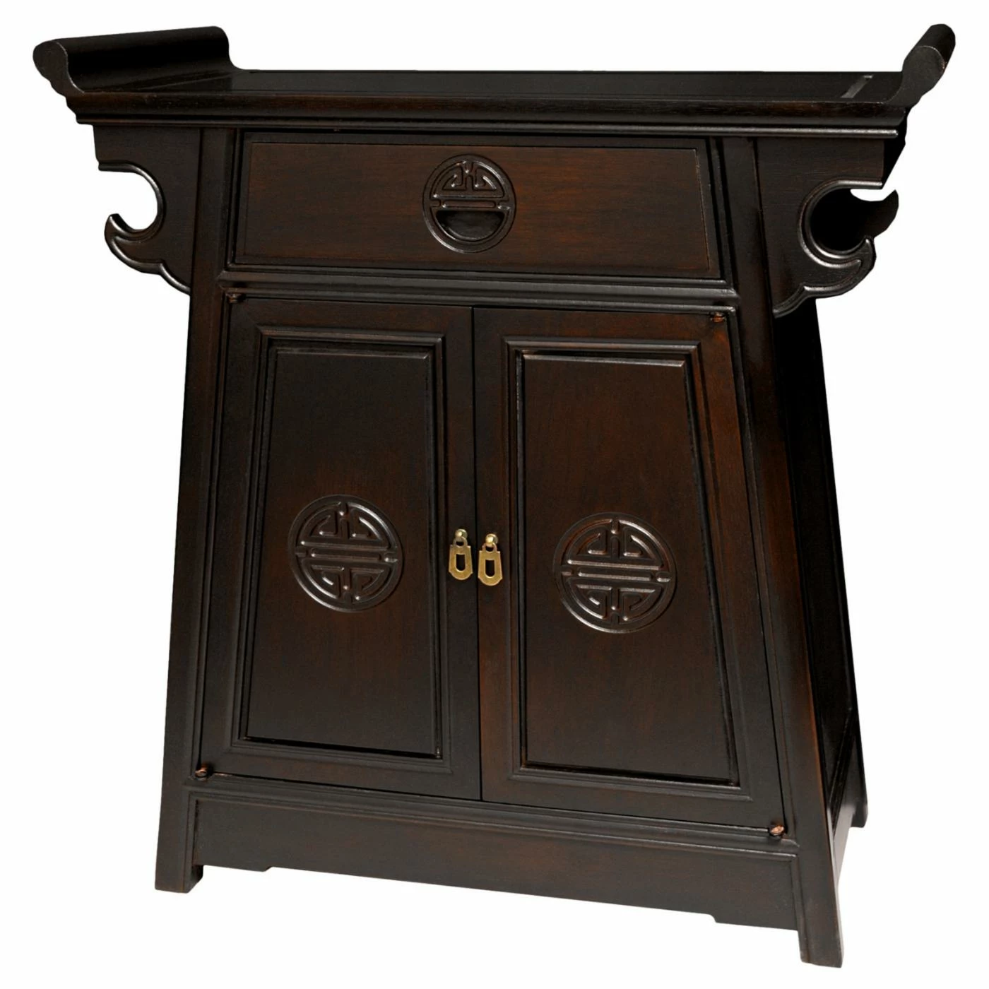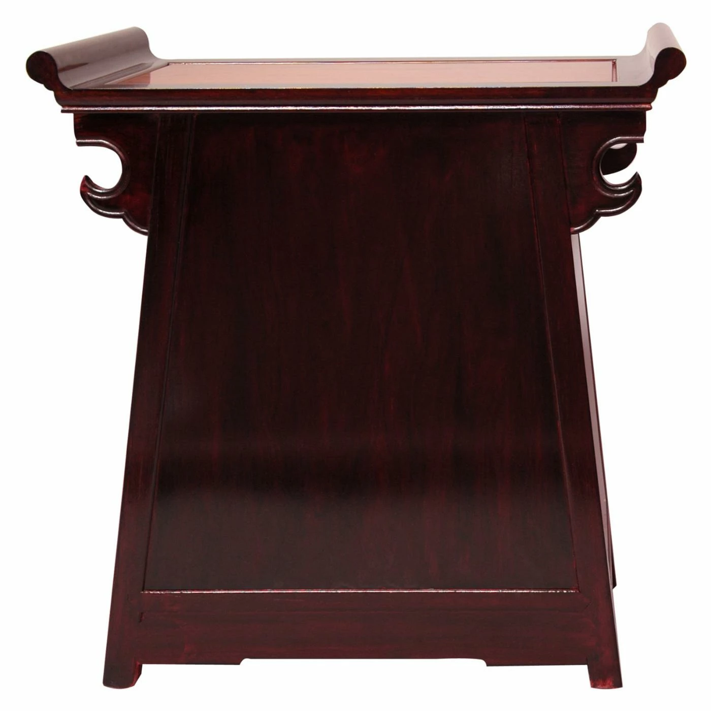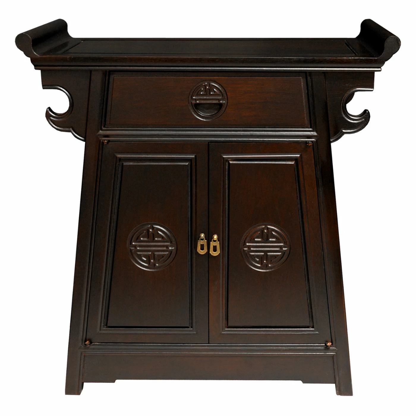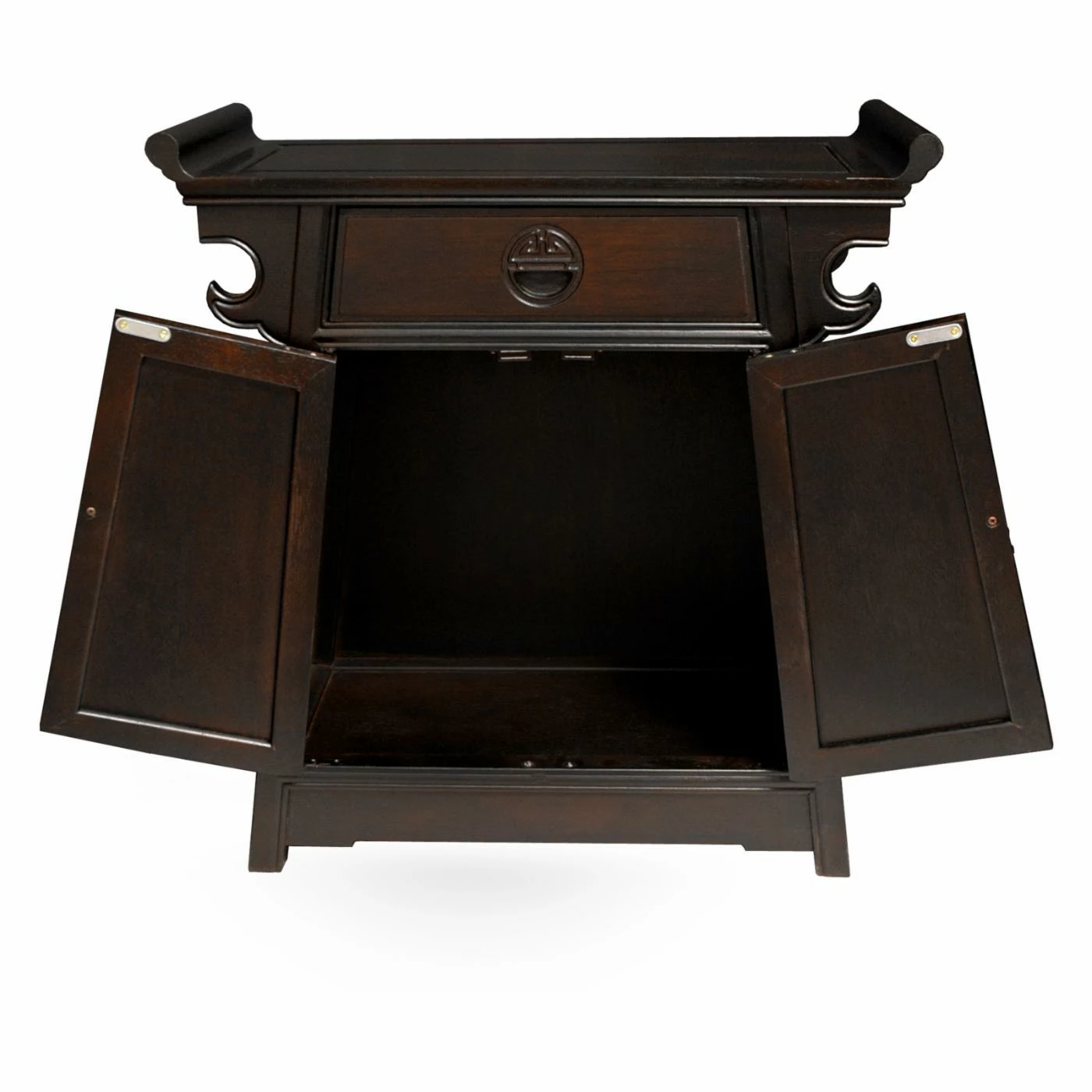 Inspired by Qing-era designs, the Oriental Furniture Rosewood Altar Cabinet will bring a distinct and elegant look to your space. It’s skillfully hand-carved from kiln-dried Rosewood and topped with hand-rubbed matte lacquer, which enhances the look and adds protective qualities. The upturned wings, decorative aprons, and traditional symbols give the piece an authentic look. Plus, it’s designed to be functional with a cabinet and a drawer that has a hand-carved handle.