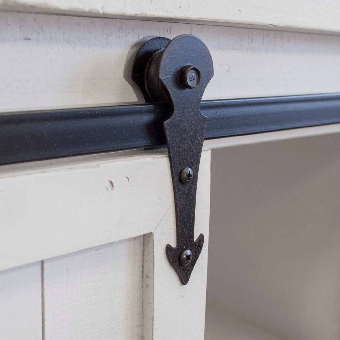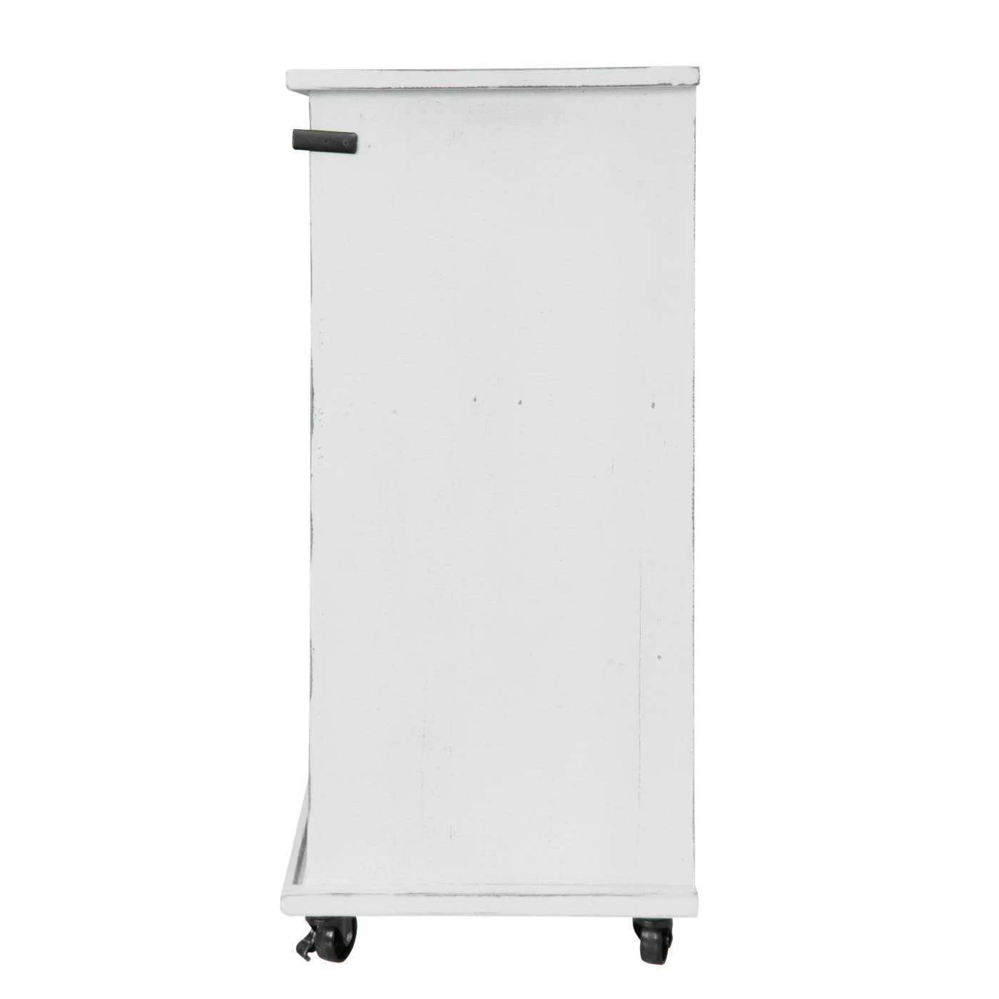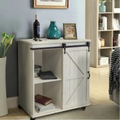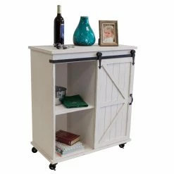 Combine style and function with this farm house styled multi use storage cabinet with sliding rustic barn door design. This will look great in your kitchen or other rooms in your home and features a distressed white finish on solid wood. Multi functional five fixed shelves and locking casters for mobility.