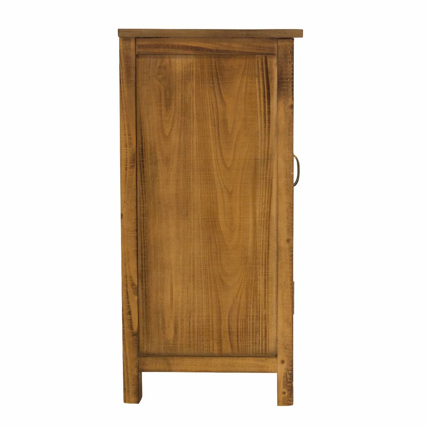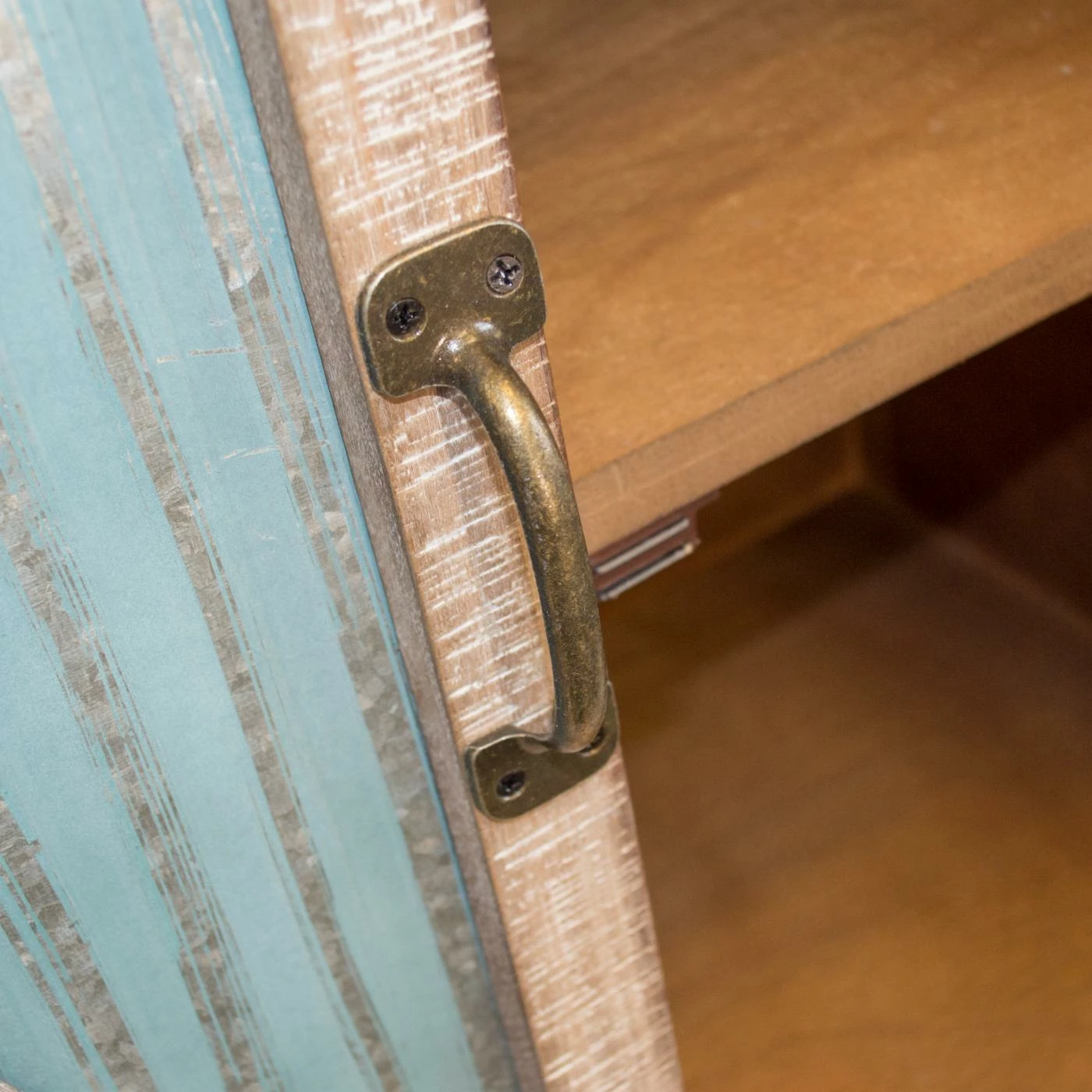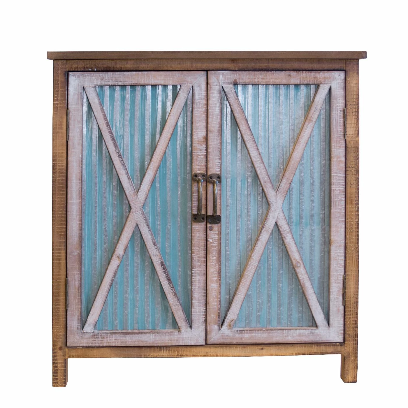 Bring a country, farm style to your home with this very functional storage accent cabinet. The two doors feature framed antique white solid wood rails matched with weathered corrugated metal. The doors have a magnetic catch and hide two spacious solid wood shelves.