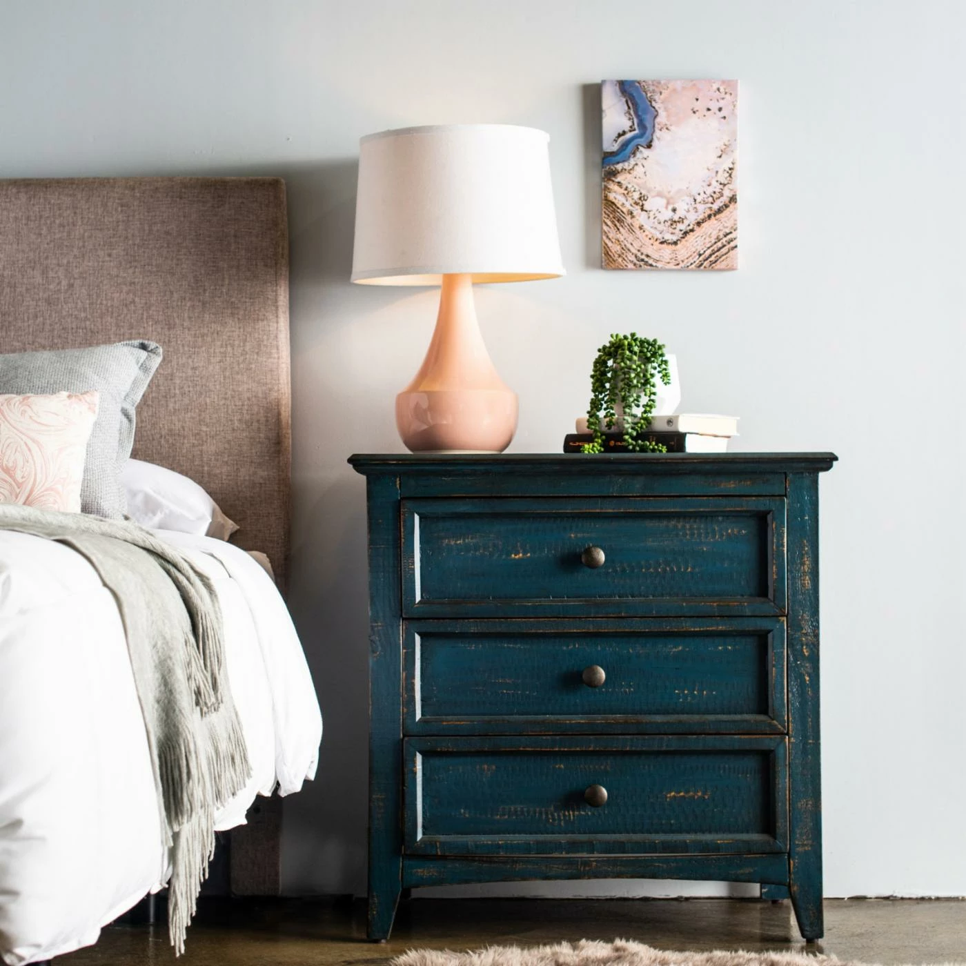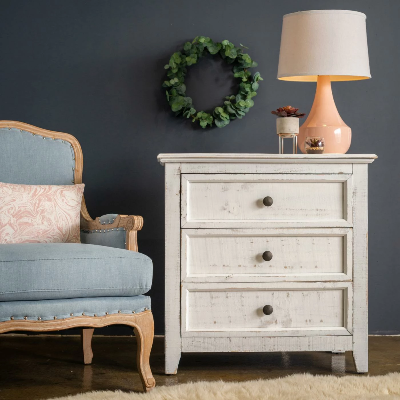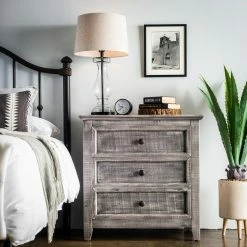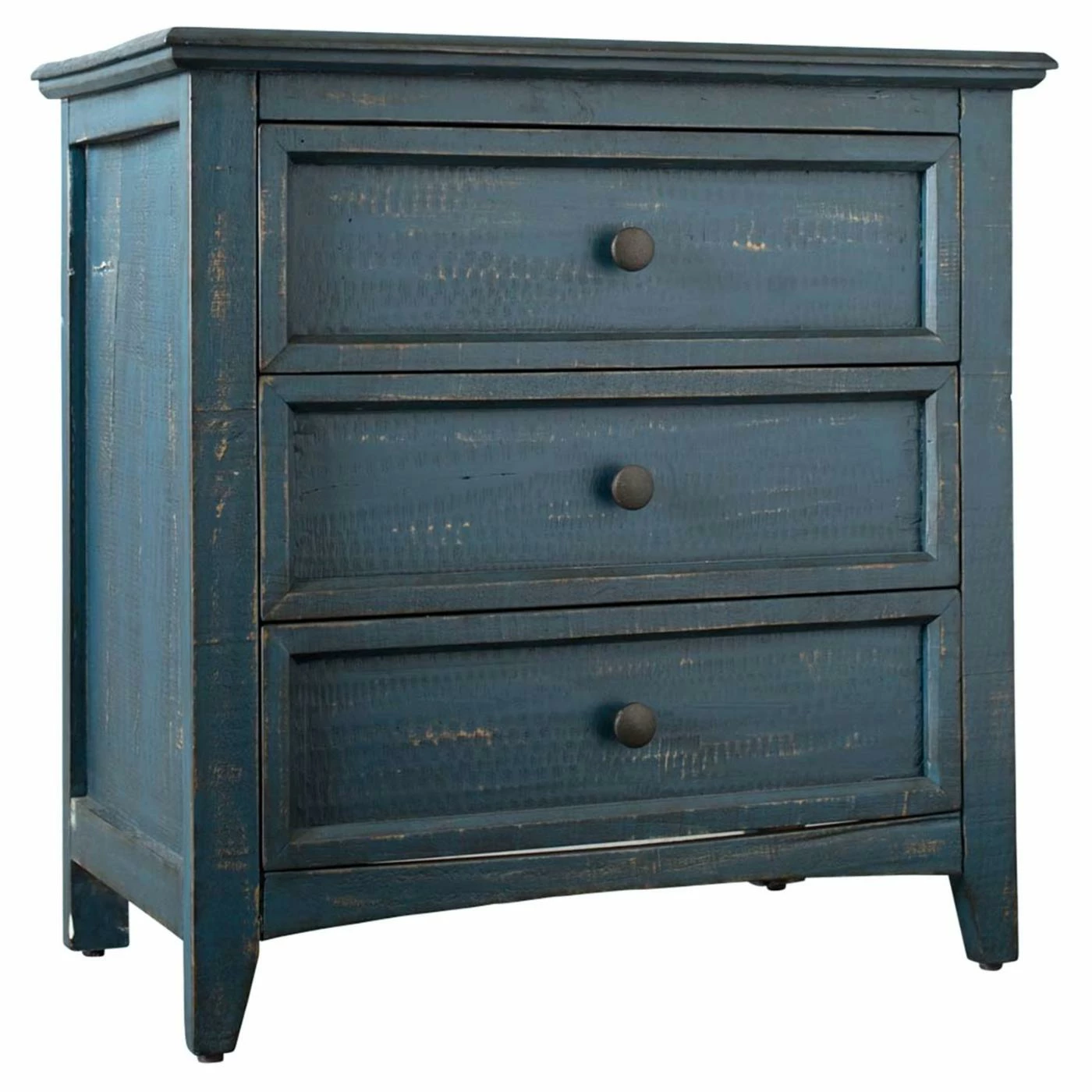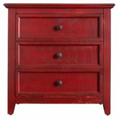 Your bedroom will have a rustic style added to it with the Picket House Furnishings Kendrick 3 Drawer Accent Chest which will keep all of your items within reach and out of sight. Three drawers have round metal hardware in dark gray. This accent chest is constructed from Brazilian pine wood in your choice of available finish options. The tapered feet have non-marking foot caps that will keep your floors safe from becoming scratched.