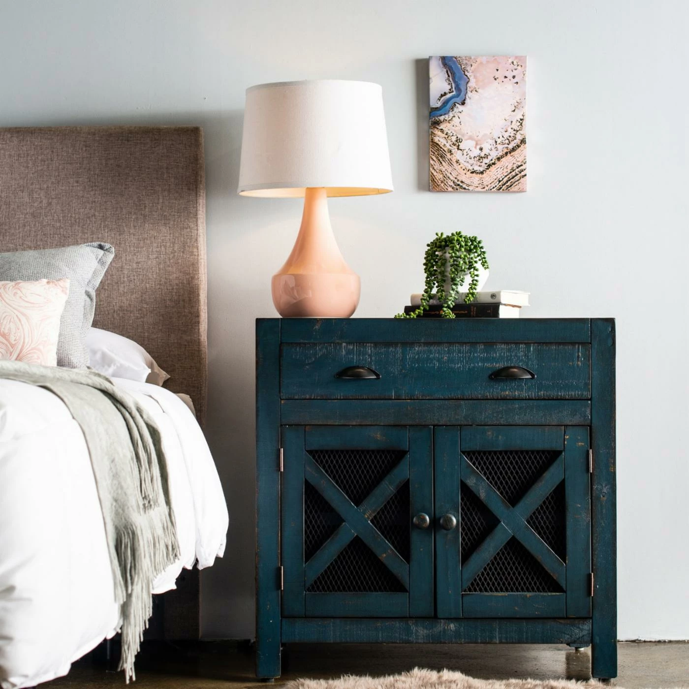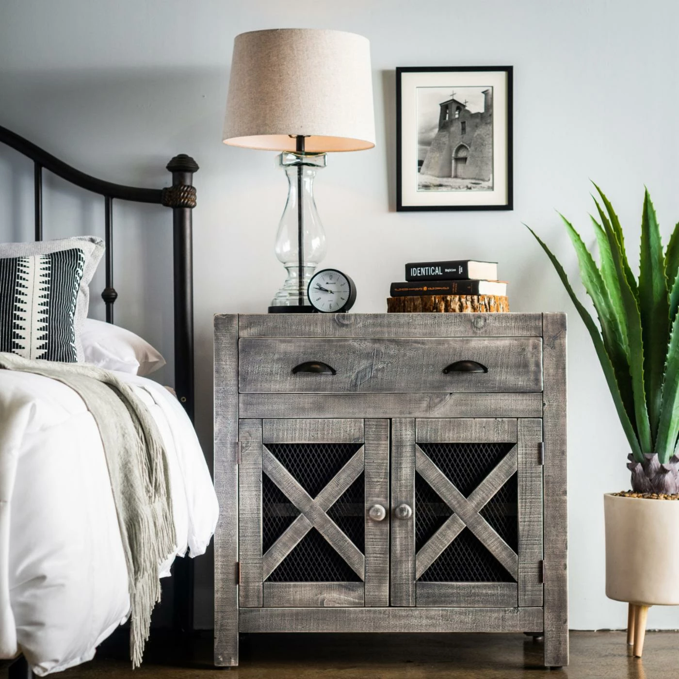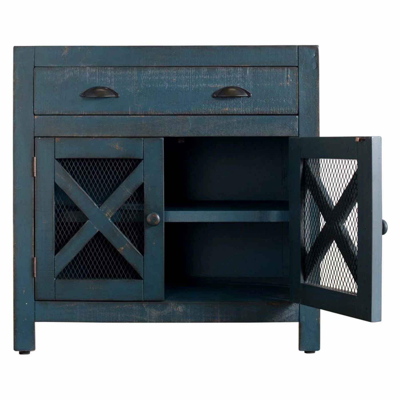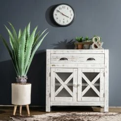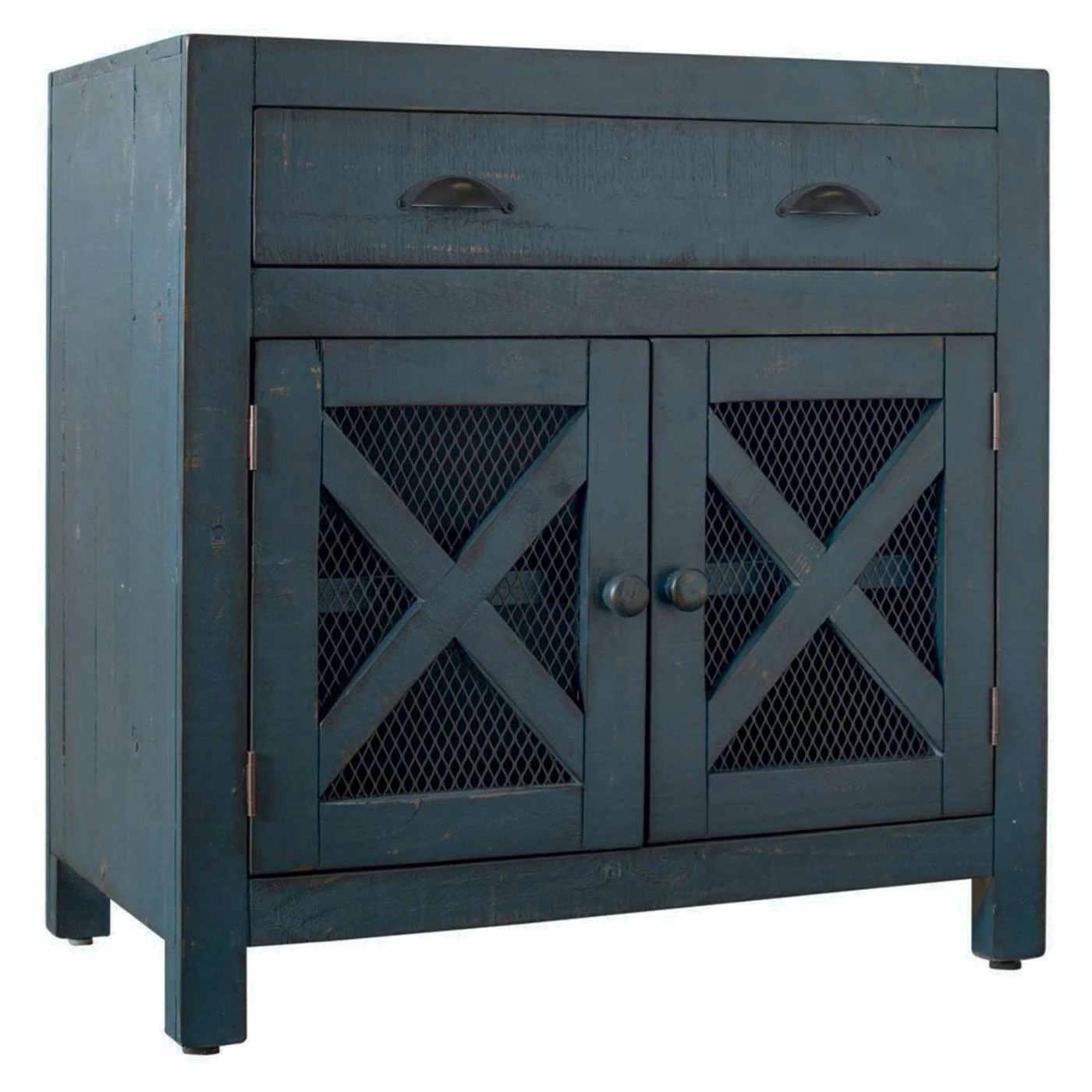 Your farmhouse styled home will be complete and organized with the Picket House Furnishings Rylan 2 Door Accent Chest. The single drawer has two black metal handles with a demilune shape. The two cabinet doors have round handles and chicken wire behind an X design. The long shelf behind the doors creates two shelves for more of your items. This accent chest is constructed from Brazilian pine wood in your choice of available finish options. The non-marking foot caps will keep your floors safe from scratching.