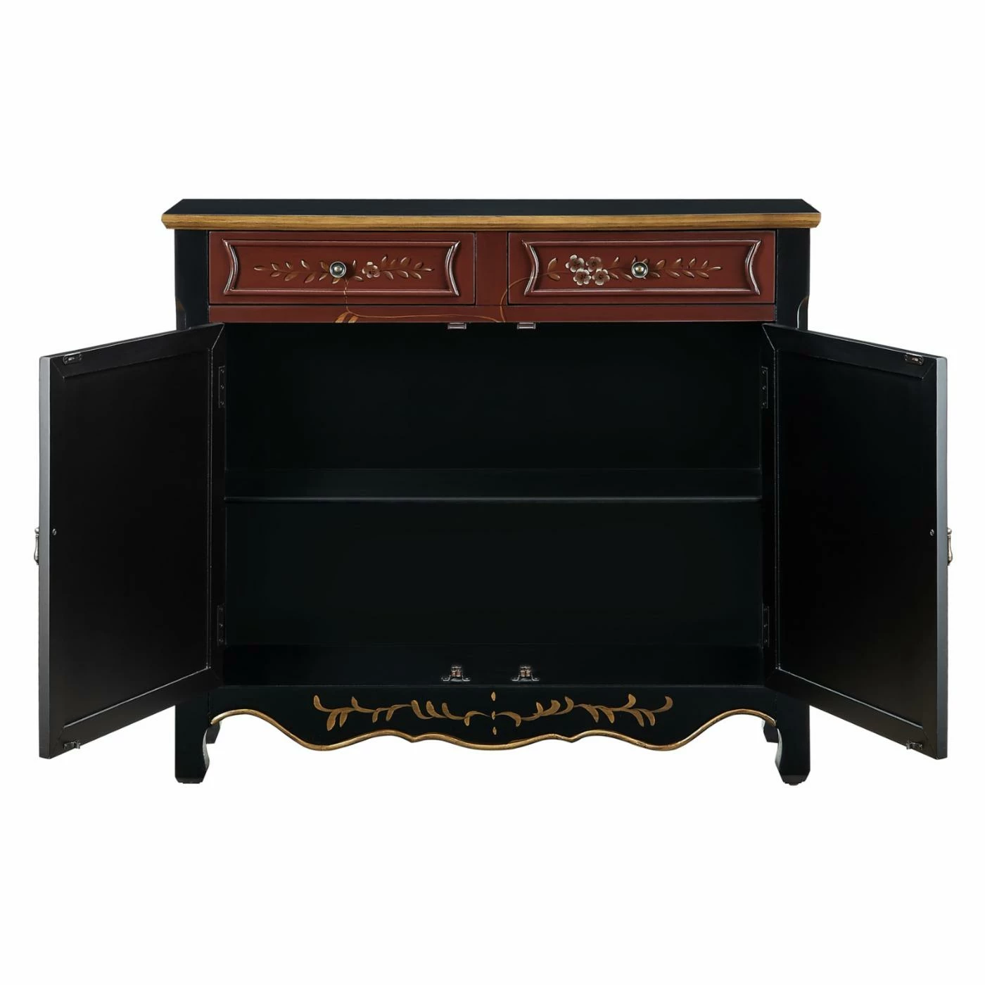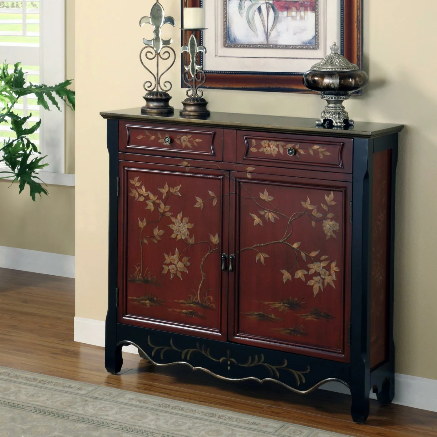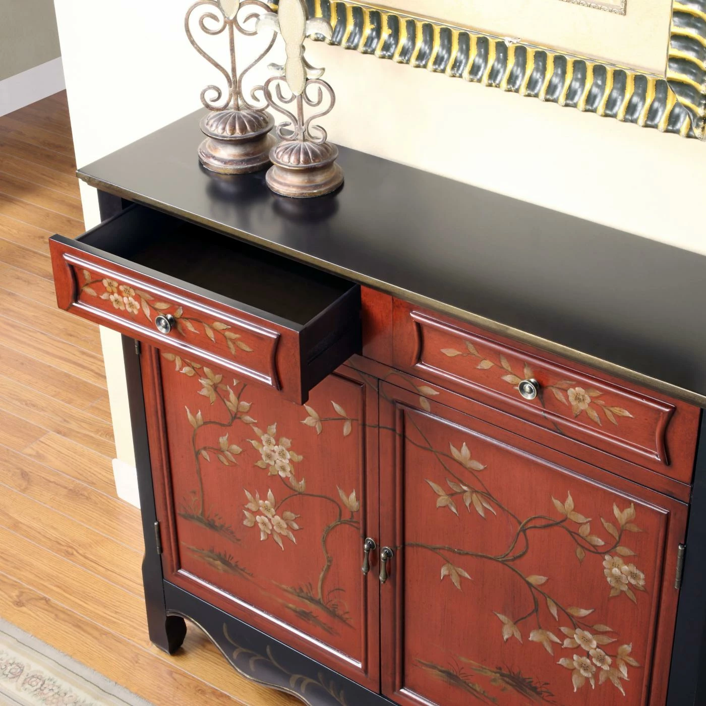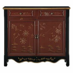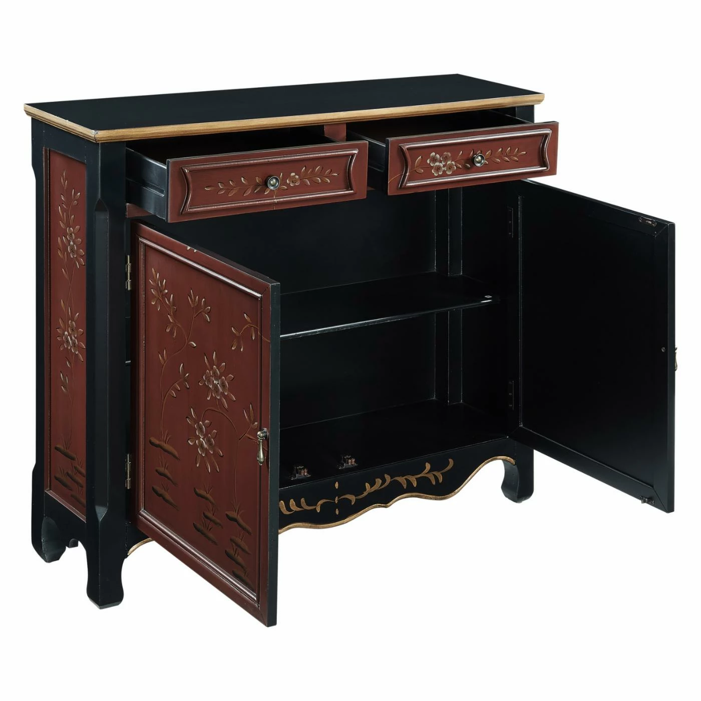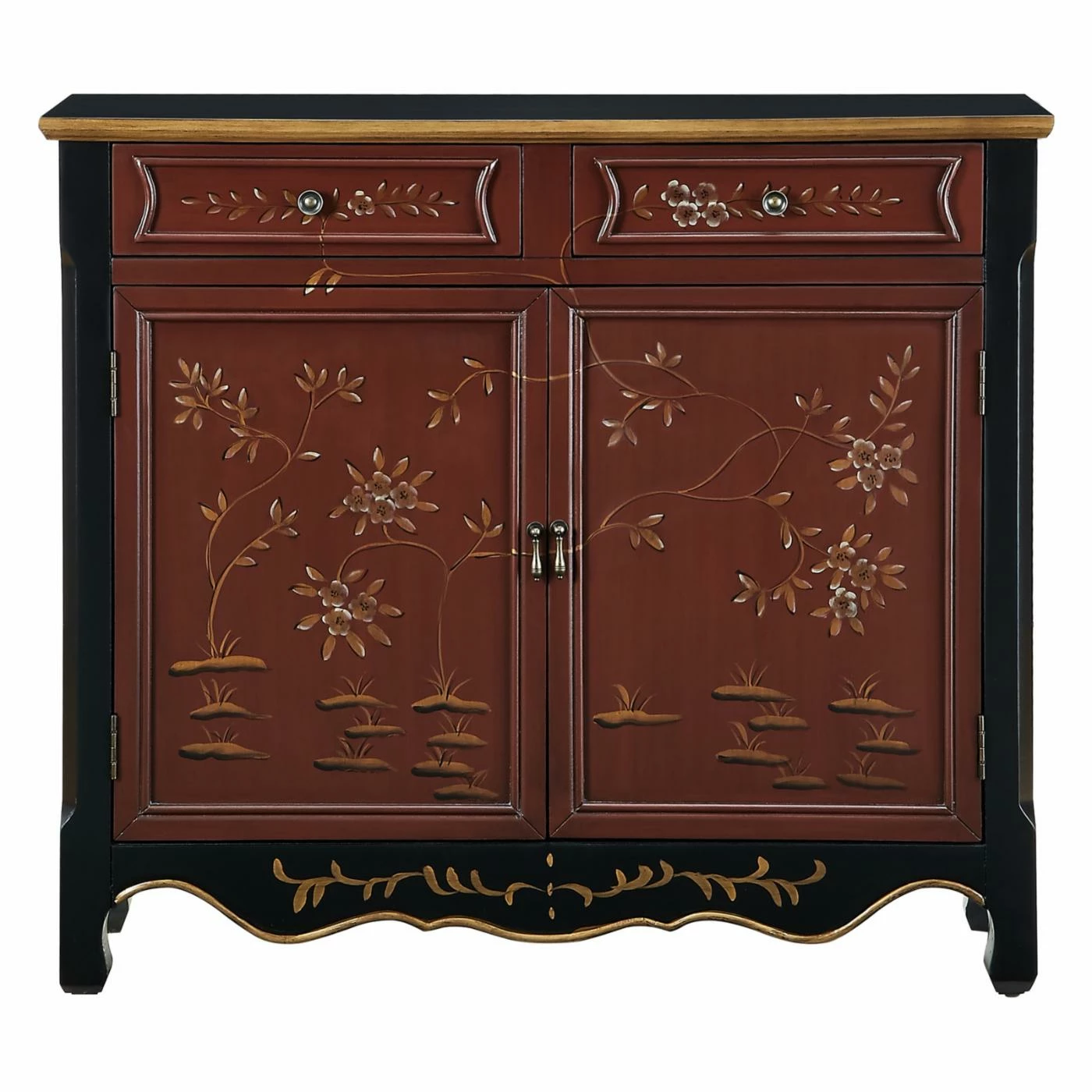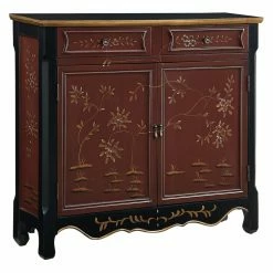 You don’t have to travel to foreign countries to bring back an exotic souvenir for your home – all you need is the Powell Oriental 2 Door Console – Red. Crafted with durable solid and engineered hardwoods, this heirloom console boasts a bold red and black finish topped with a delicate gold Asian-inspired leaf print that speaks to the mysteries of far-away lands. It speaks to your home’s own mysteries, too – tuck away treasures in the cabinet space behind the two front doors. At the top, two narrow drawers are fronted with decorative trim and hardware. Shaped feet and a carved apron at the bottom complete the console’s Old World charm.