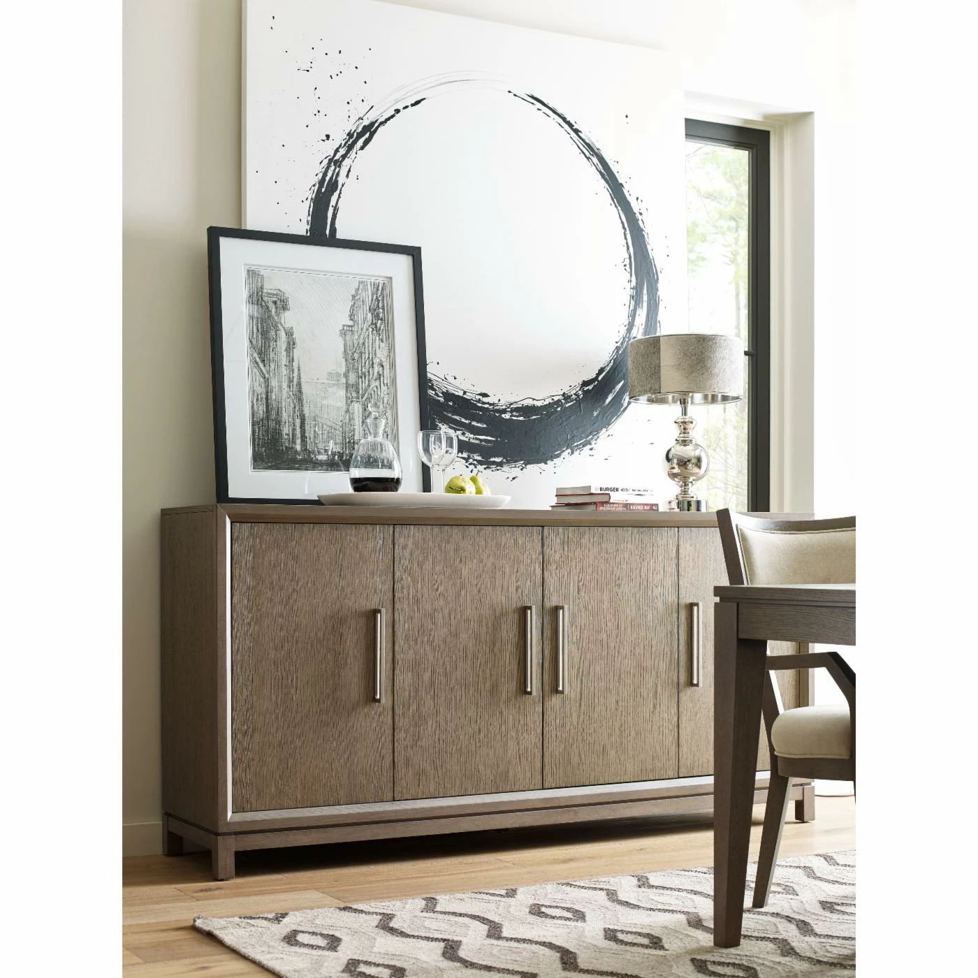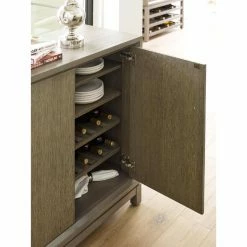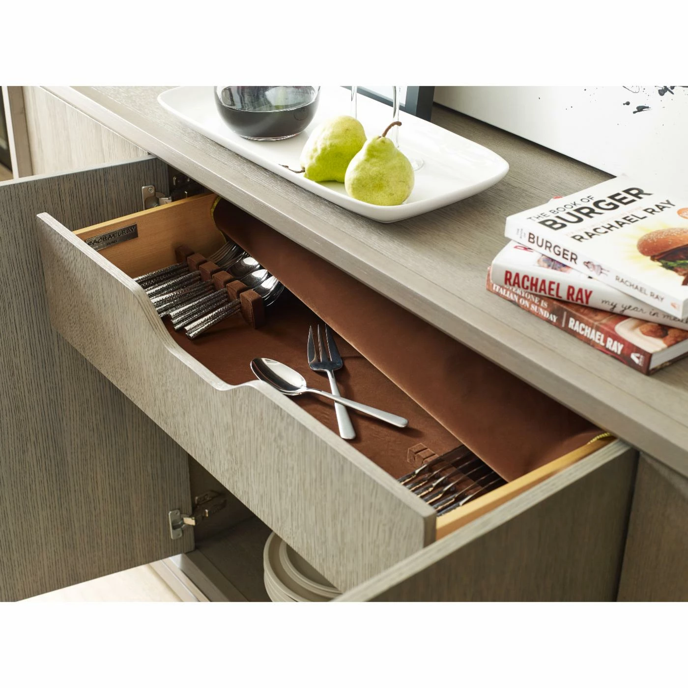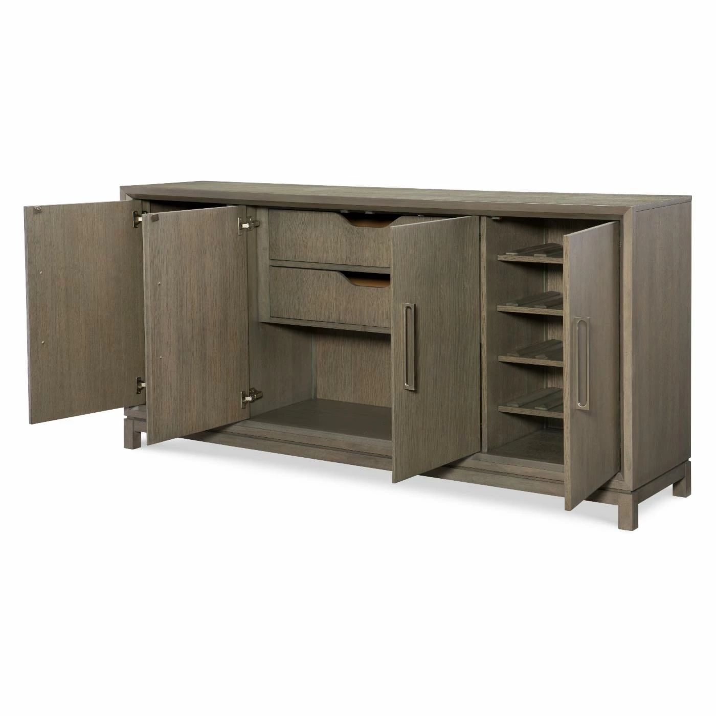 Ensure you’re always ready to entertain by storing serving pieces, flatware, and more in the Rachael Ray Highline by Legacy Classic Credenza. Open the four doors to find an assortment of smart storage solutions. Adjustable wine racks reverse to become simple shelves and the top drawer opens to reveal a felt-lined silverware tray. This storage-savvy credenza is beautifully-crafted of poplar solids and white oak veneers in a versatile greige finish.
