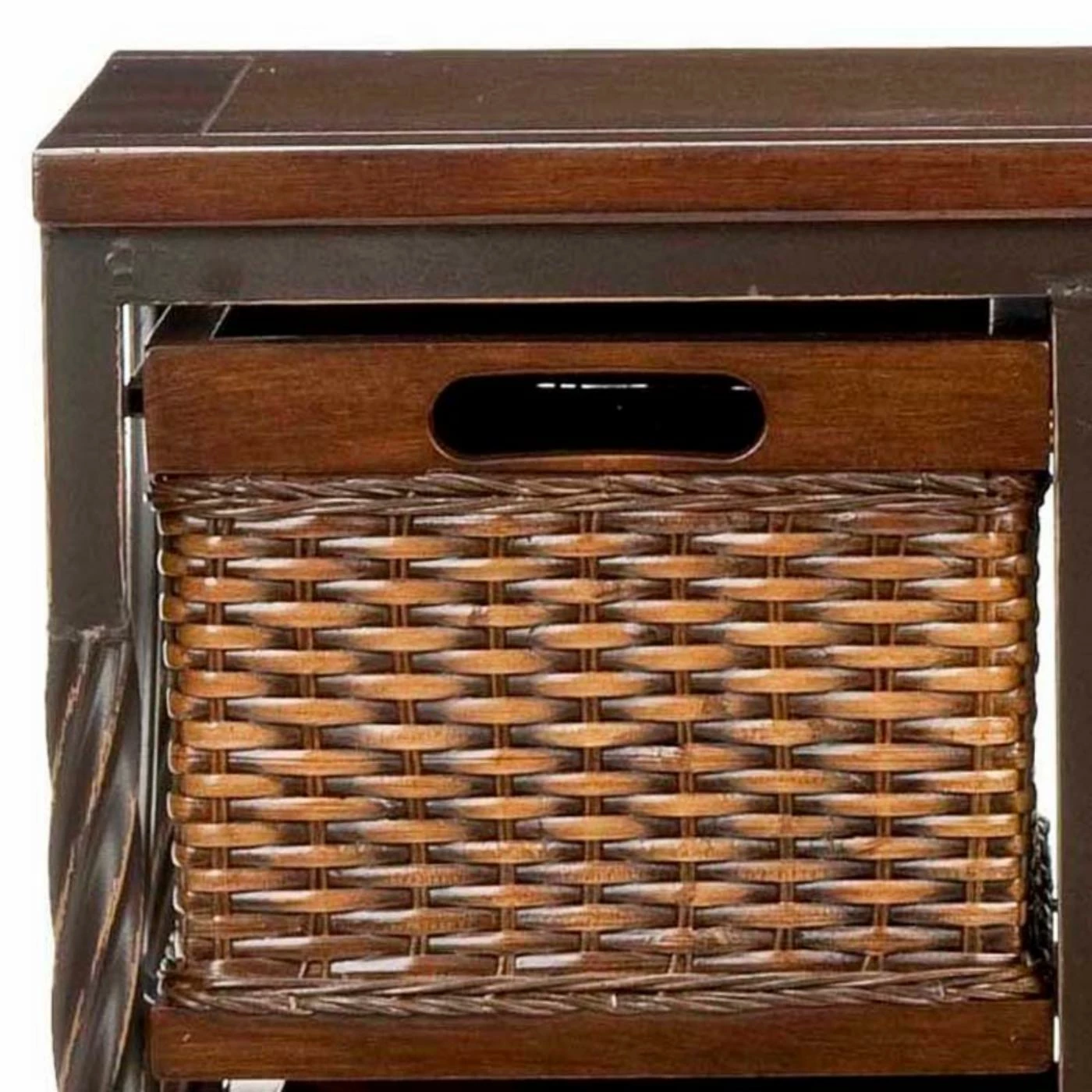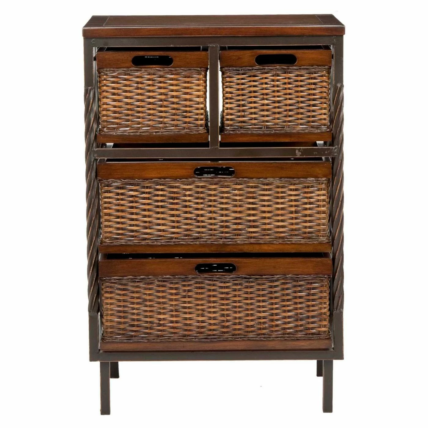 Drawing inspiration from the organic designs of Frank Lloyd Wright, the Safavieh Andrew 4 Drawer Storage Unit adds natural appeal and needed storage space to interiors. Woven cane drawers slide completely out of the twisted iron frame, making it easy to load up clutter like shoes, toys, and media. A wood top complements the finish on the two full-width and two half-width basket drawers.