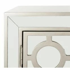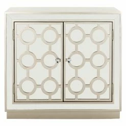 Mirrored accents and a champagne finish give the Safavieh Kaia 2 Door Chest its glamour. Conjoined rings form an overlay that allows the mirrors to shine through. This chest features two cupboard doors and plenty of open storage inside. Use it for stylish storage in your hallway, bedroom, or living room.
