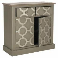 Adorned with a chain link lattice, the Safavieh Petula Chest adds modern flair and extra storage space to interiors. The solid fir and engineered wood chest keeps small items organized with two drawers. Swing open the lower doors to reveal a spacious compartment for storing bulkier belongings. Simple gray knobs ensure that the attention stays focused on the decorative doors and drawer fronts.