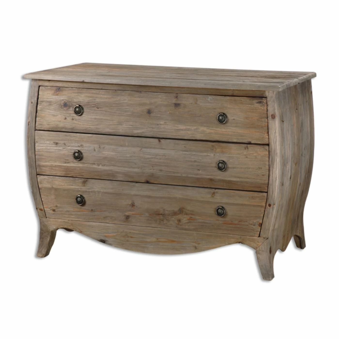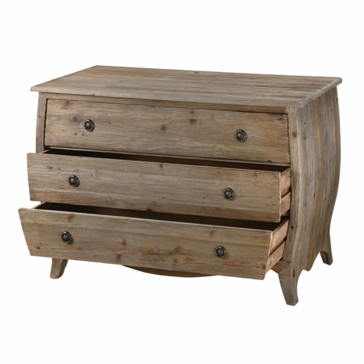 Inspired by the timeless French bombe silhouette, the Uttermost Gavorrano 3 Drawer Bombe Foyer Chest definitely has a certain je ne sais quoi about it. Youβll love how the lightly burnished reclaimed pine has a gray wash that accentuates the natural grain of the wood, while the three drawers are dotted with Empire-style ring pulls in a dark antique brass finish. Use it in your foyer, entryway, living space, or even dining room – itβs a tres chic addition wherever it sits. Packaged using Uttermostβs reinforced packaging system.