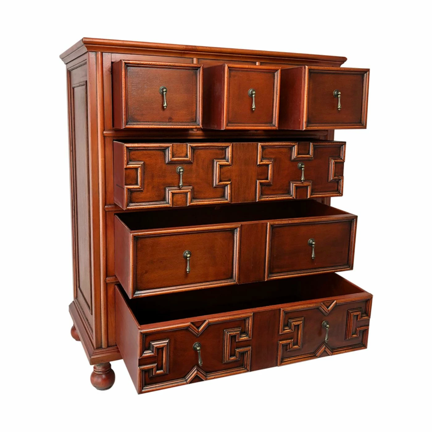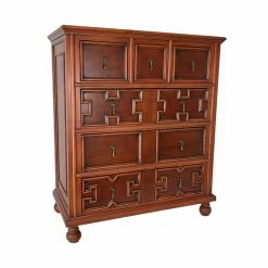 The Wayborn English 6 Drawer Chest boasts stunning hand craftsmanship and impressive storage. It’s crafted of basswood with hand carved geometric details. This chest is complete with a cherry finish, three small drawers, and three large drawers.
