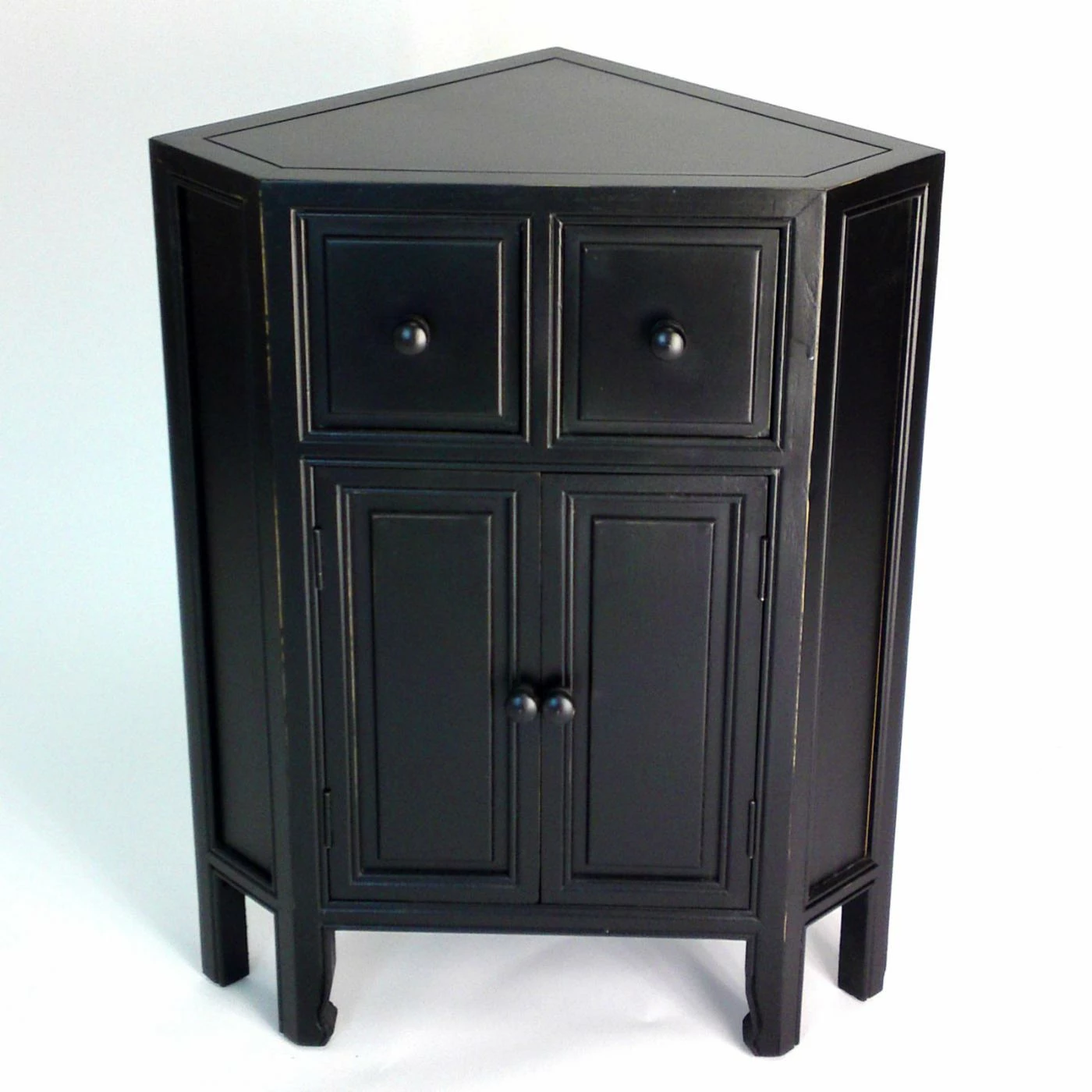 For a touch of timeless Asian design and handy storage, tuck the Wayborn Suchow Corner Chest into any corner. This handsome corner chest boasts a simple design with Asian-inspired leg carvings. It doesn’t take up much floor space, yet offers a triangular top for display, two roomy drawers, and two doors for interior storage. This corner chest is built of pine and pine veneers in a thoughtfully distressed antique black.