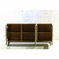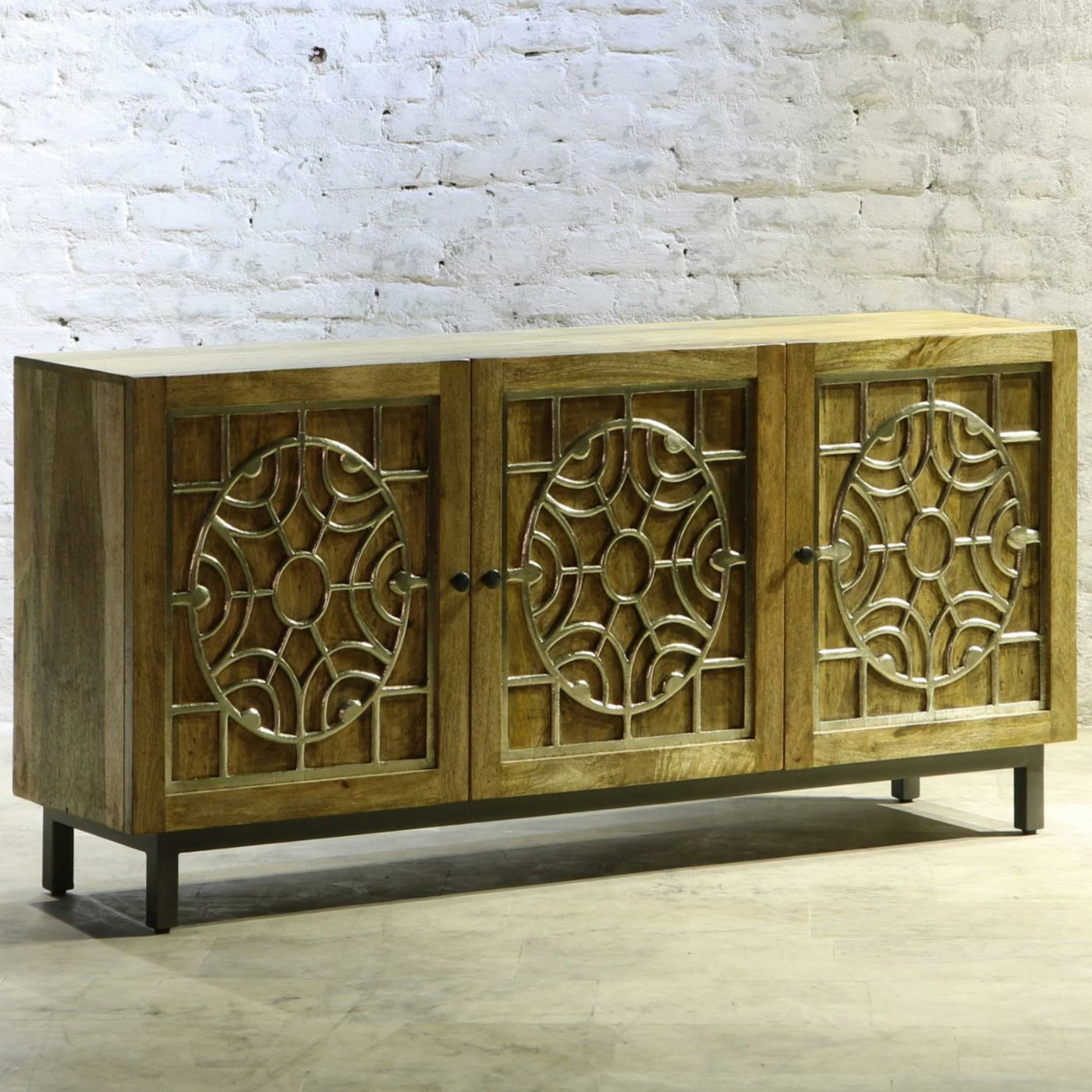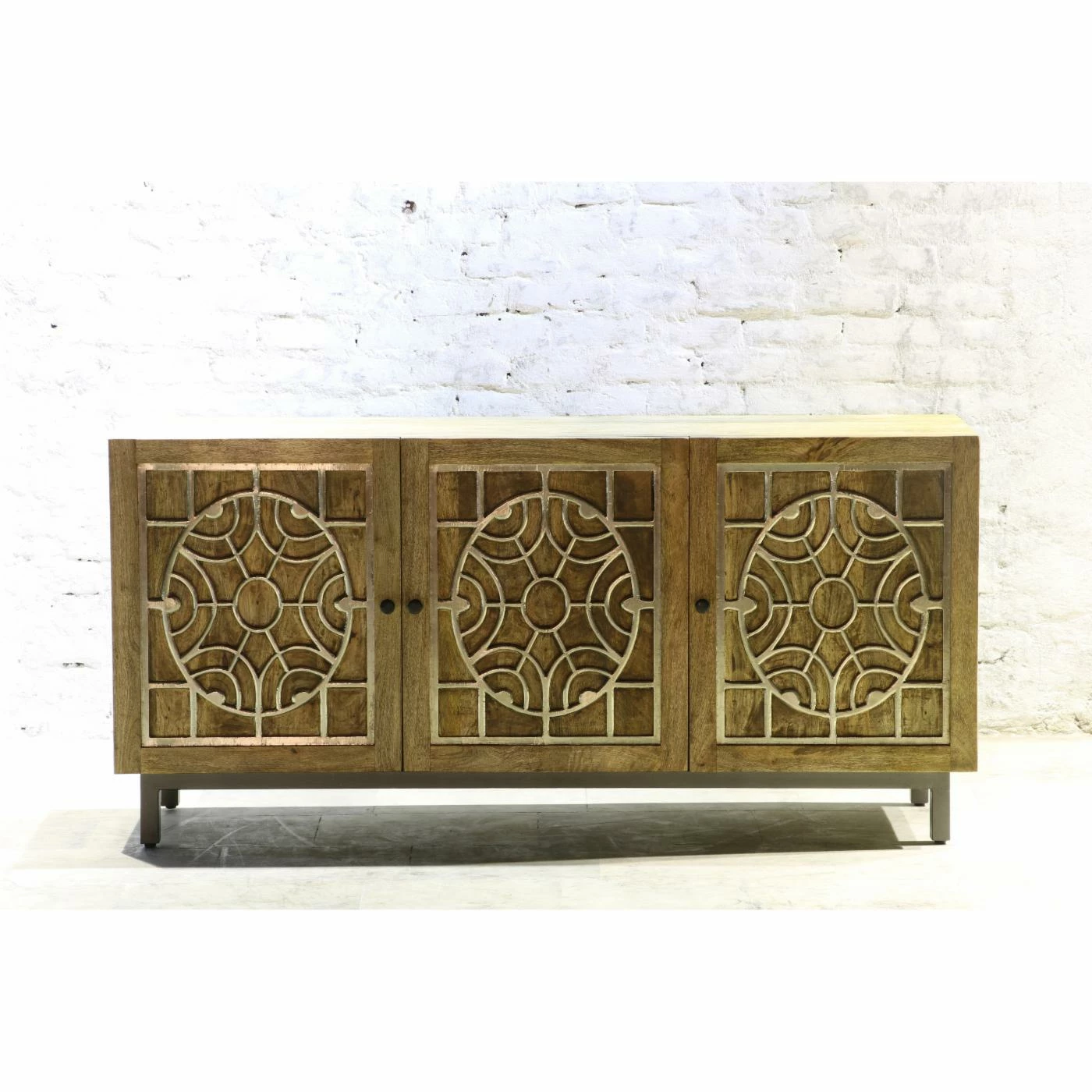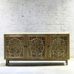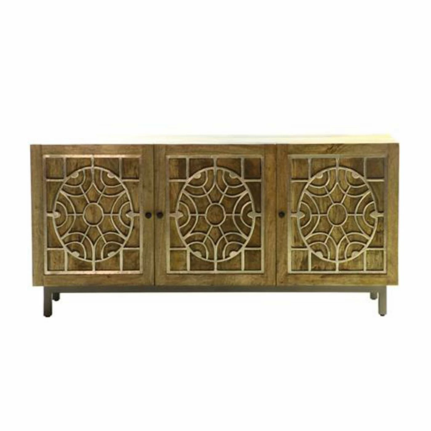 Style this wide yet slim Yosemite Home Decor Dream Weaver Console Cabinet in your entryway to provide a chic welcome to guests. This solid mango wood console cabinet was handcrafted by a master artisan, so slight imperfections are inherent to the style and no two are exactly alike. Hand-carved filigree detailing in a golden metal foil graces each of its three doors. Three removable shelves inside offer versatile storage options.