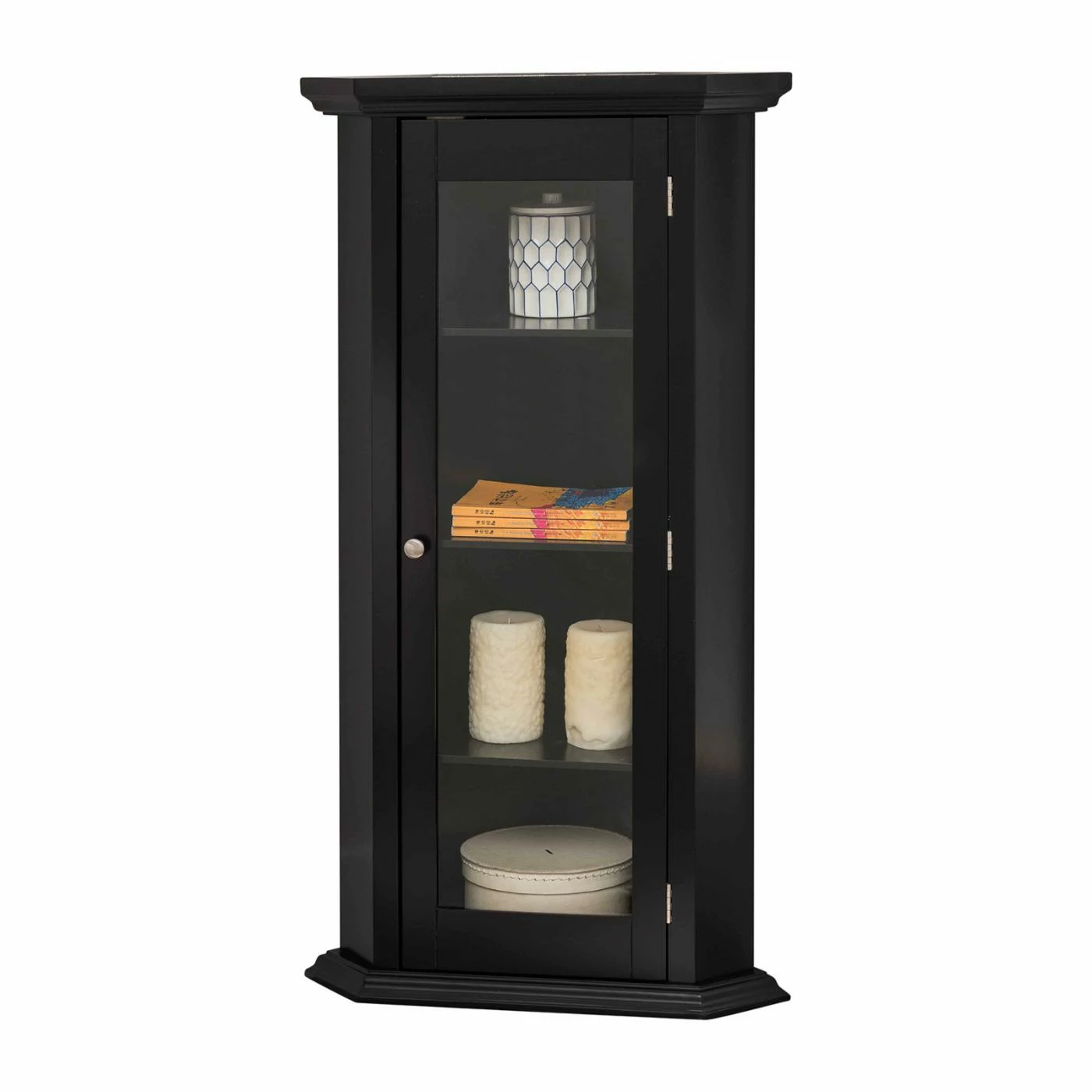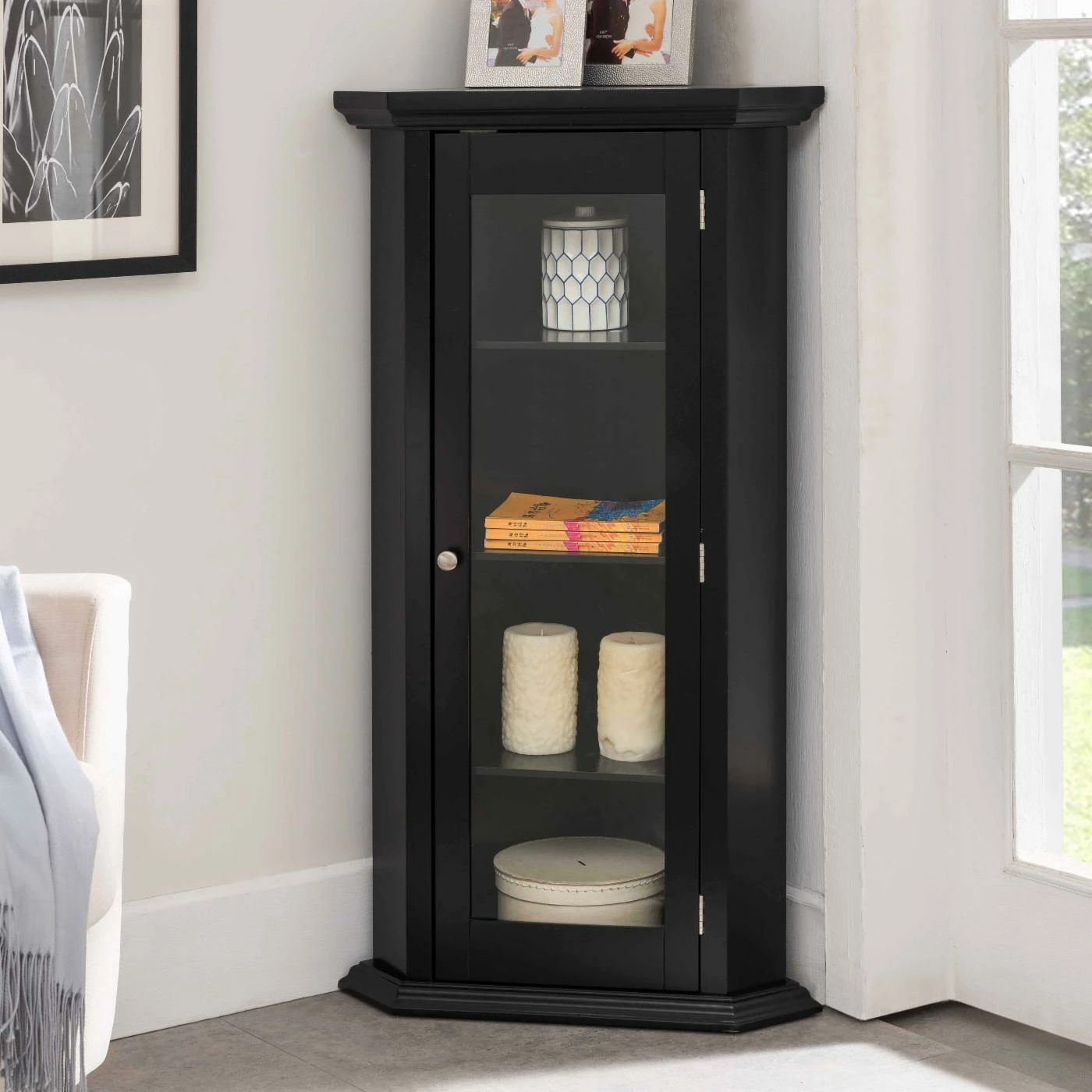 Boasting a sleek black finish, the K&B Furniture Black 1 Door Corner Accent Cabinet is a stately addition to your space. This cabinet is crafted from durable wood with a chic glass front door. Inside, four shelves provide plenty of convenient storage.