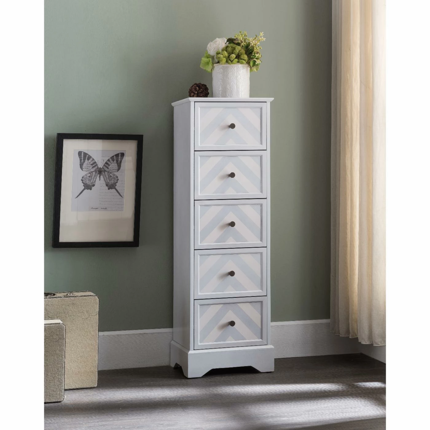 The K&B Furniture R0445 Wood 5 Drawer Accent Cabinet is made from wood, and it showcases a subtle chevron pattern in shades of white. This accent cabinet features five drawers, each with a round metal pull. The upright style of this accent cabinet makes use of vertical space, freeing up floor space.