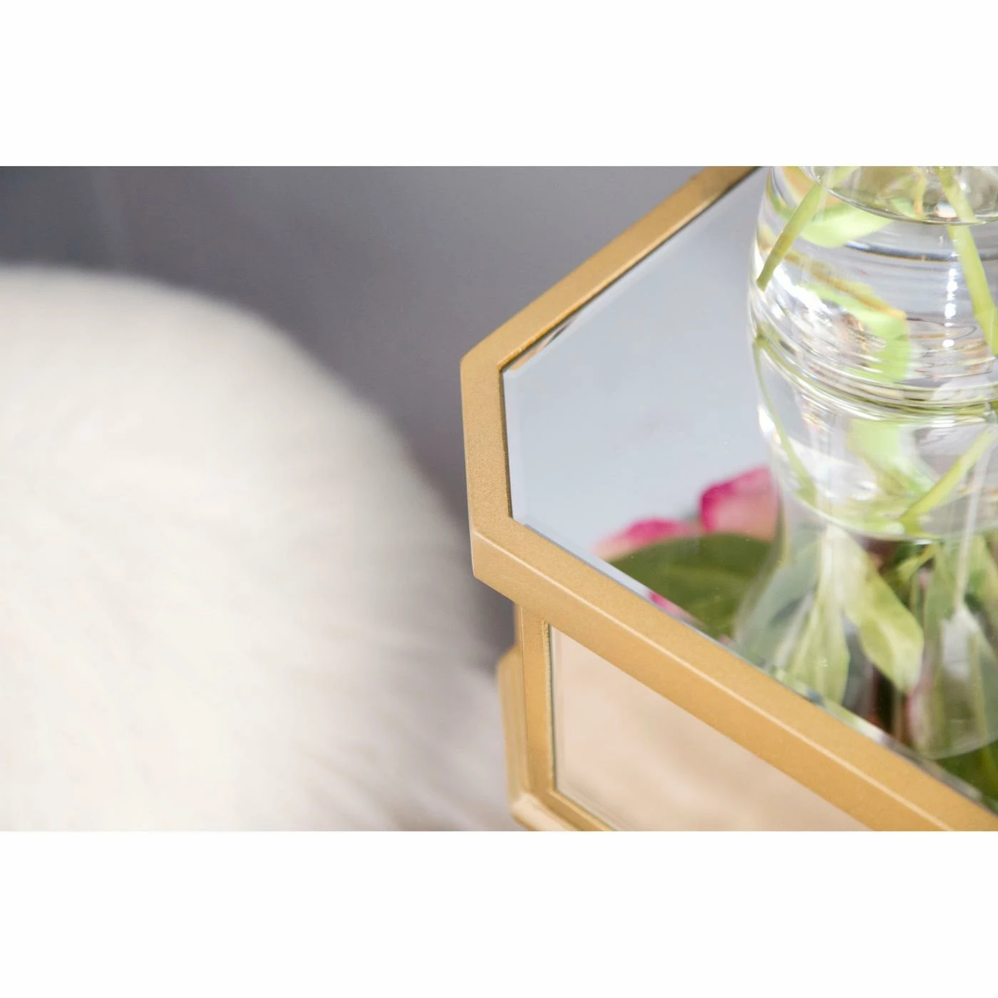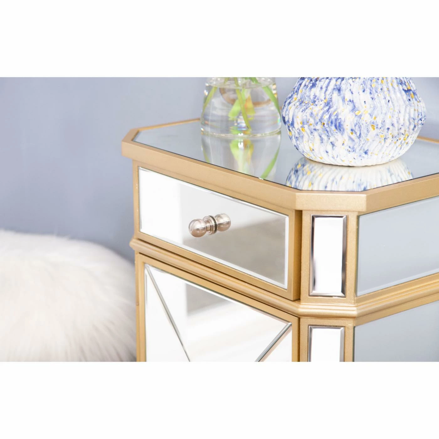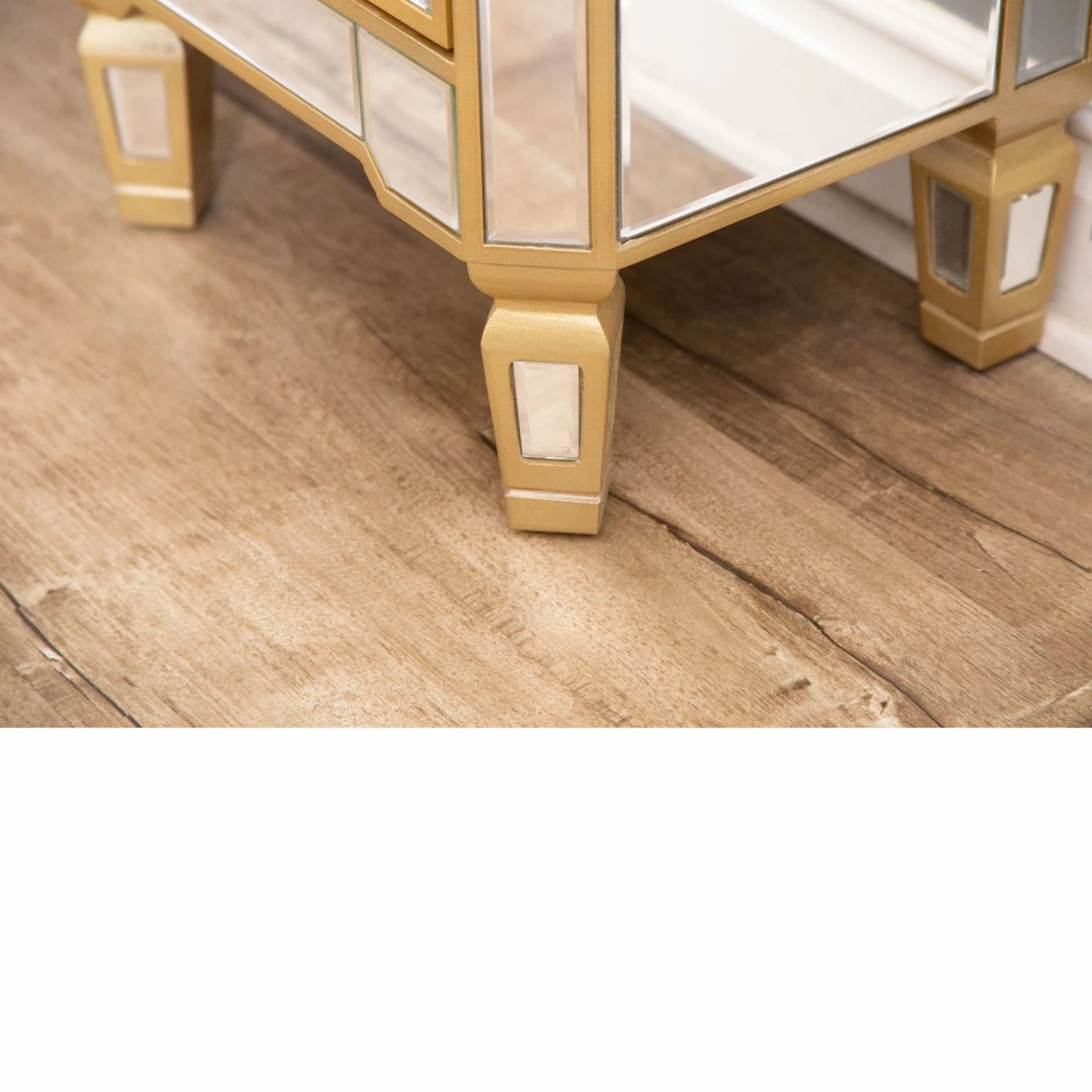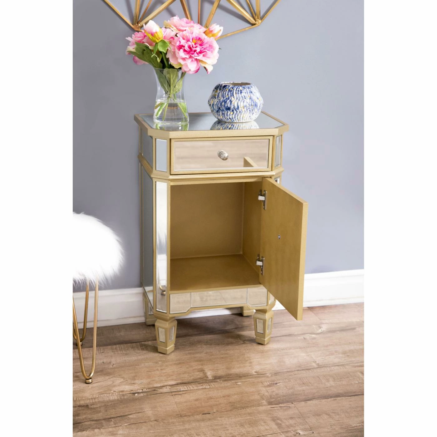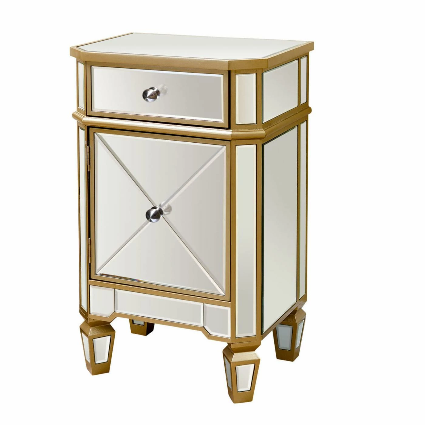 The Abbyson Lesley Cabinet Chest dazzles the senses with a fresh, trendy aesthetic. With shimmery mirrored surfaces on all sides, this chest amplifies the colors and stylistic sensations you’ve chosen for your space. Use the Lesley as a nightstand, powder room storage piece, or end table. One drawer and one cabinet door offer convenient storage space. Detailed gold trim surrounds each mirror panel, and the angled legs have a tapered spade shape.