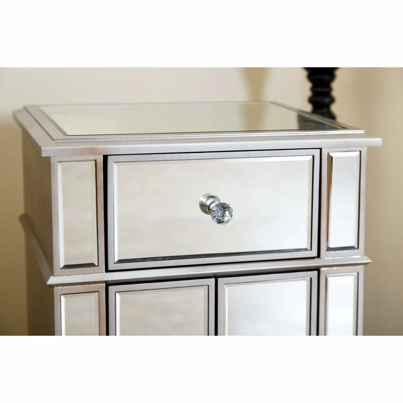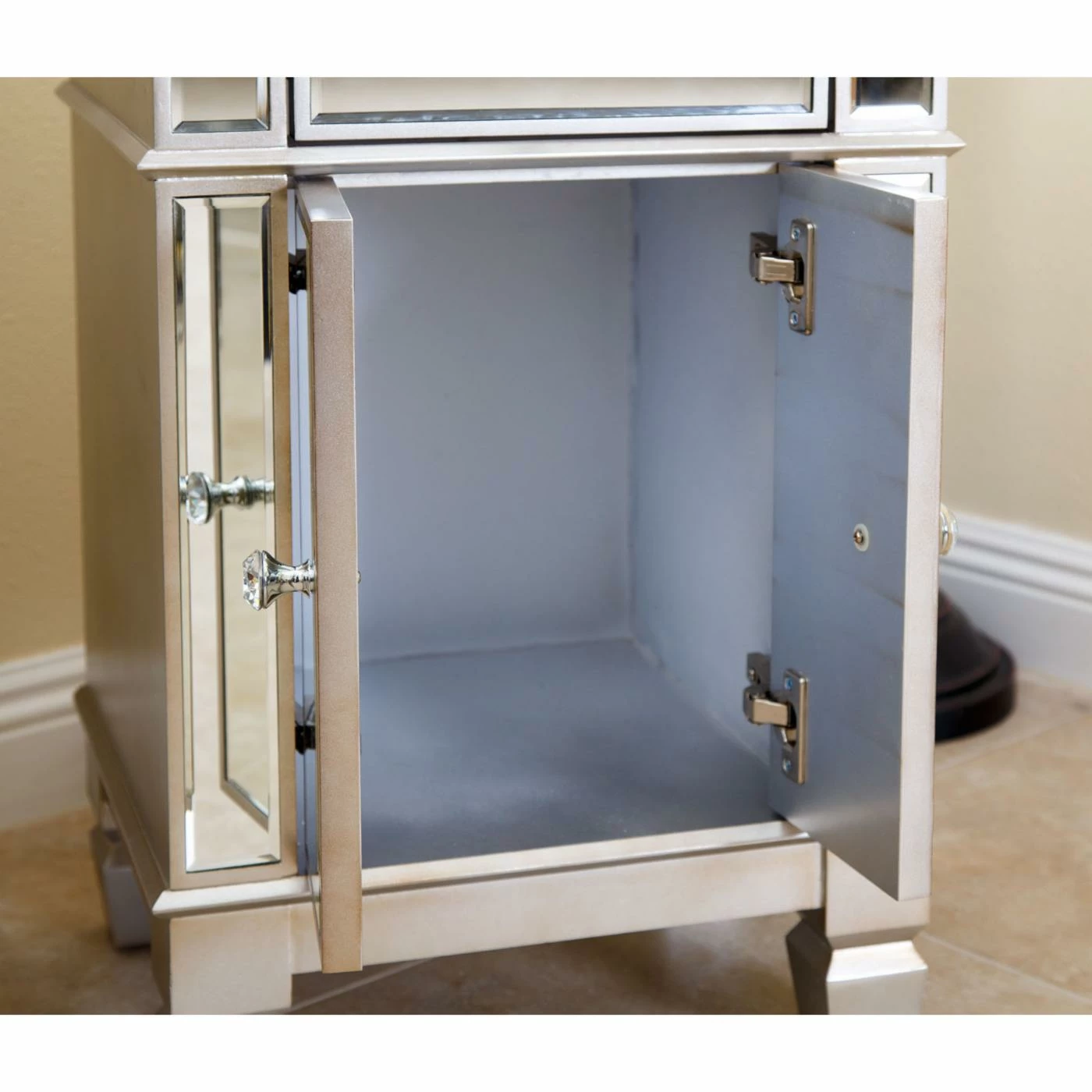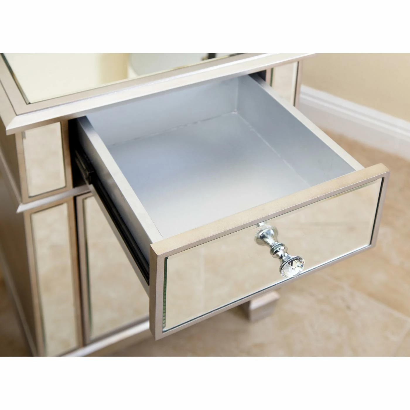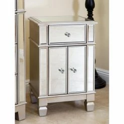 A slam-dunk in terms of fashion and function, the Abbyson Shirley Accent Table can serve as a nightstand, end table, or powder room organizer. Two slim cabinet doors open to reveal concealed storage space below the single drawer. The silver finish coordinates with all-over mirrored panels that adorn the wooden frame.