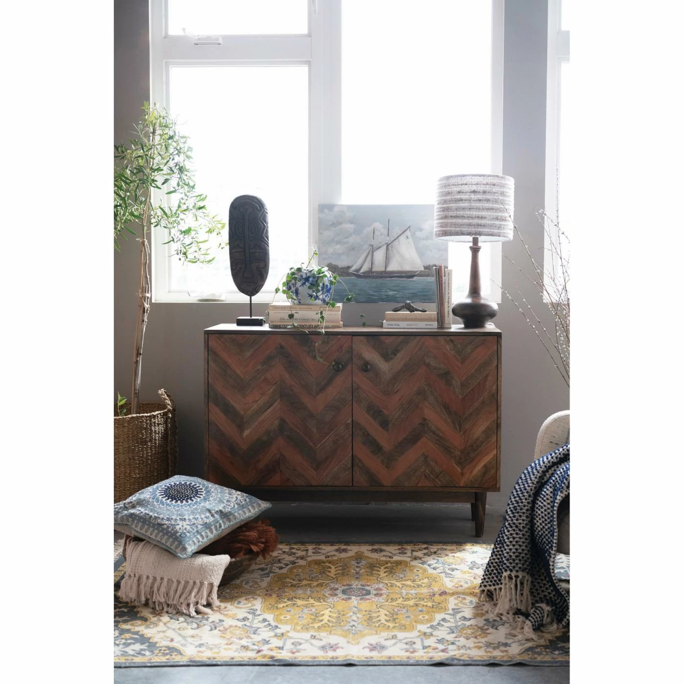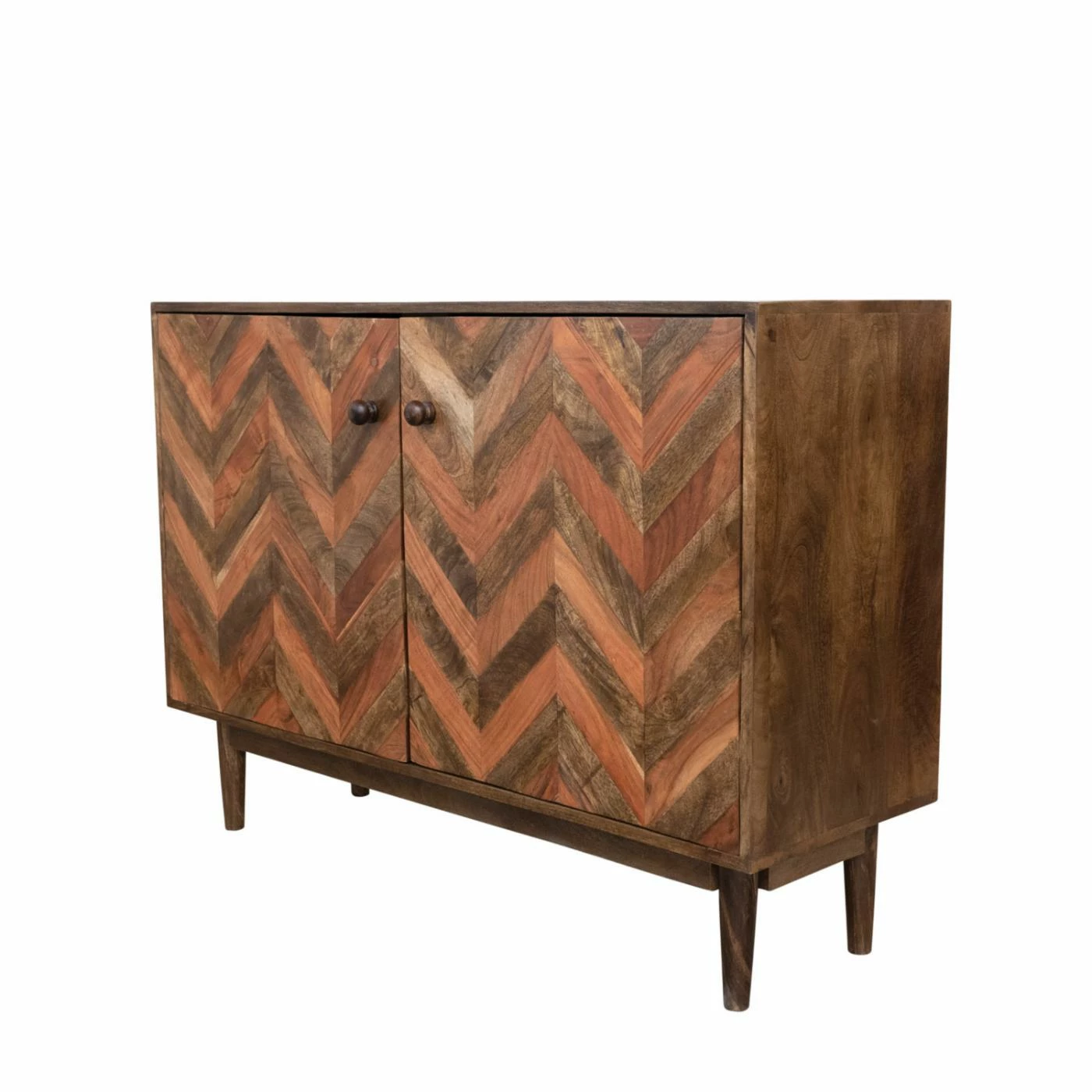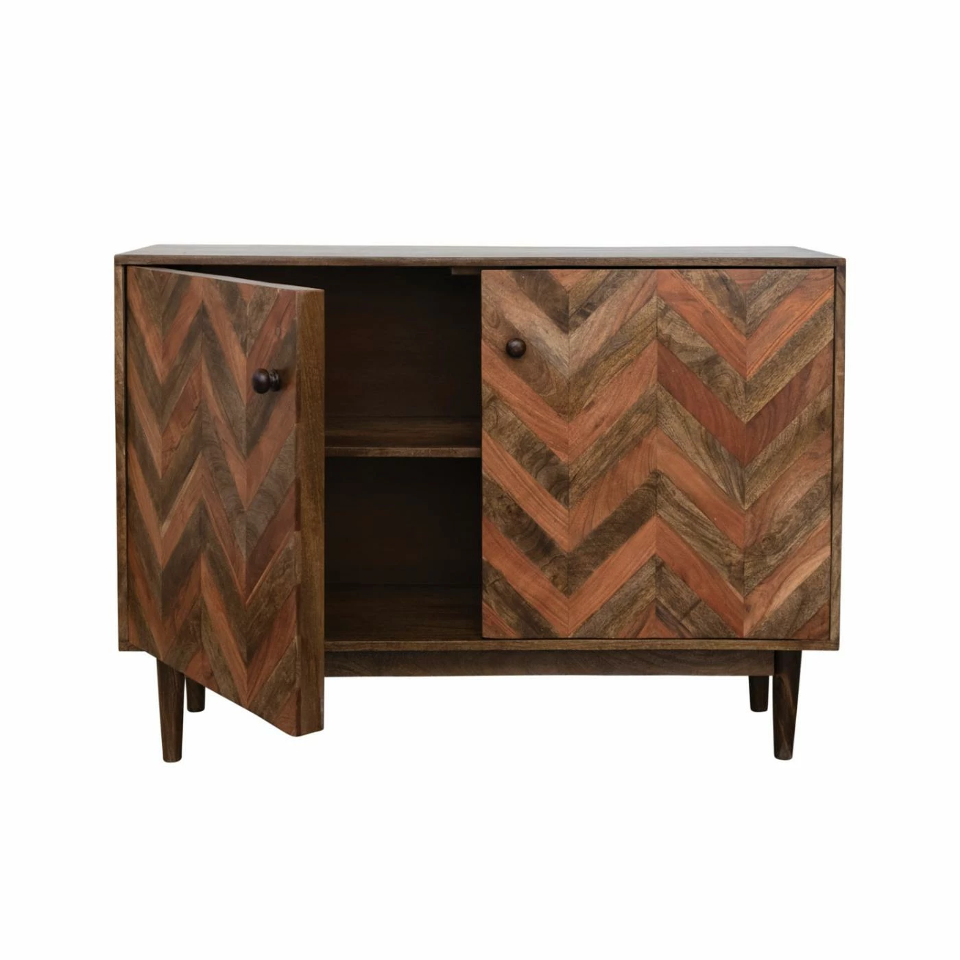 Add a touch of functional style to a dining space or entryway with this striking console table. Made from 100% mango wood. This mid-century inspired mango wood console table showcases a contemporary chevron pattern with 2 doors and 1 shelf. This piece will go perfect with any mid – century style dΓ©cor.