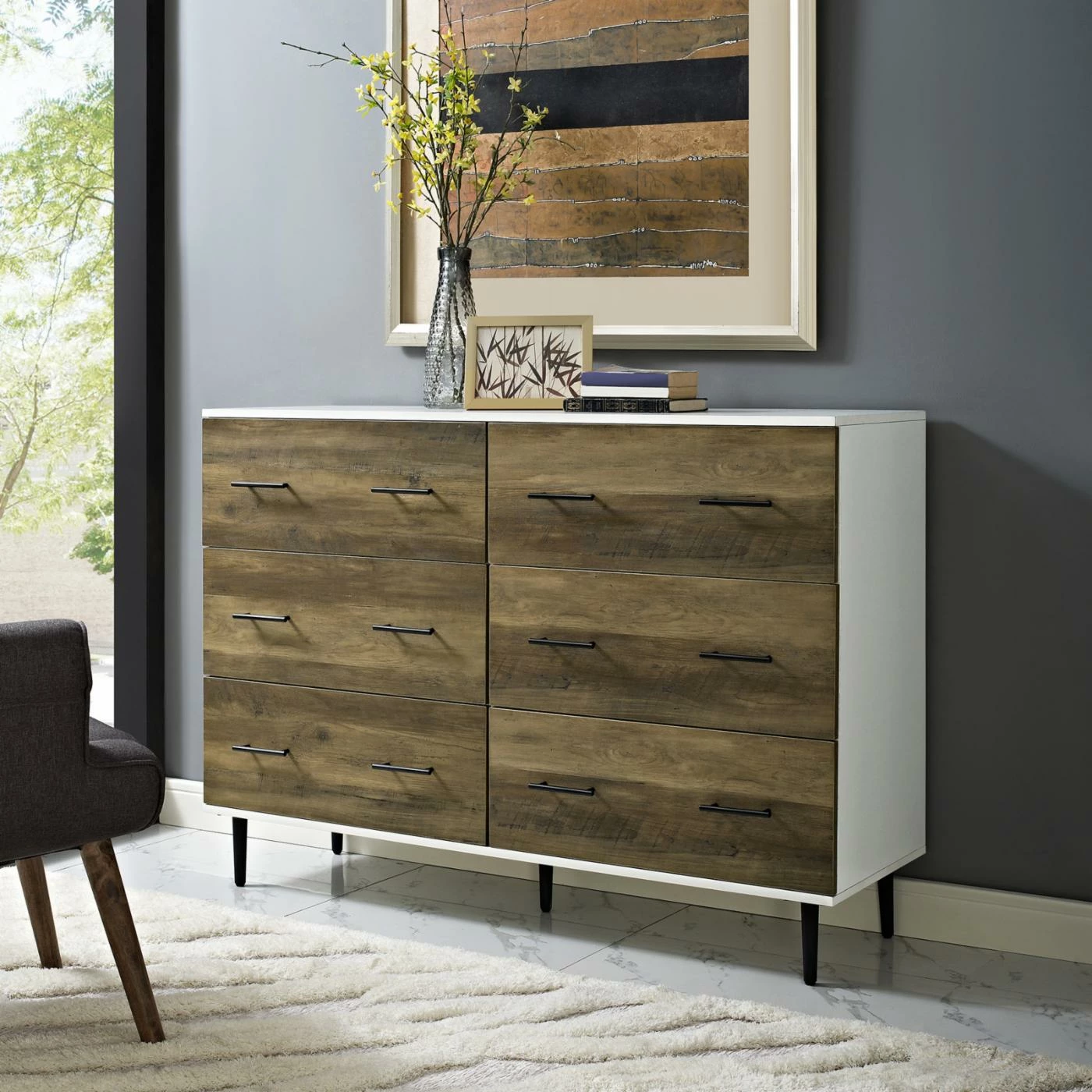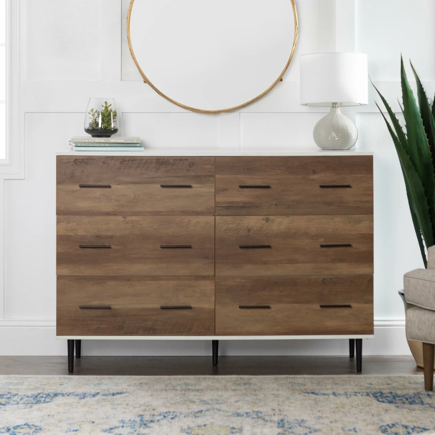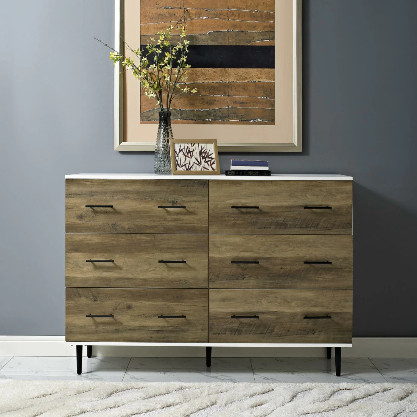 The rustic, farmhouse charm of the Manor Park 52 in. Reclaimed 6-Drawer Storage Chest adds a warm accent to your living room. The weathered front is contrasted by the sleek white top. Six smooth-glide drawers provide ample storage, while metal hardware complements the style. Assembly required.