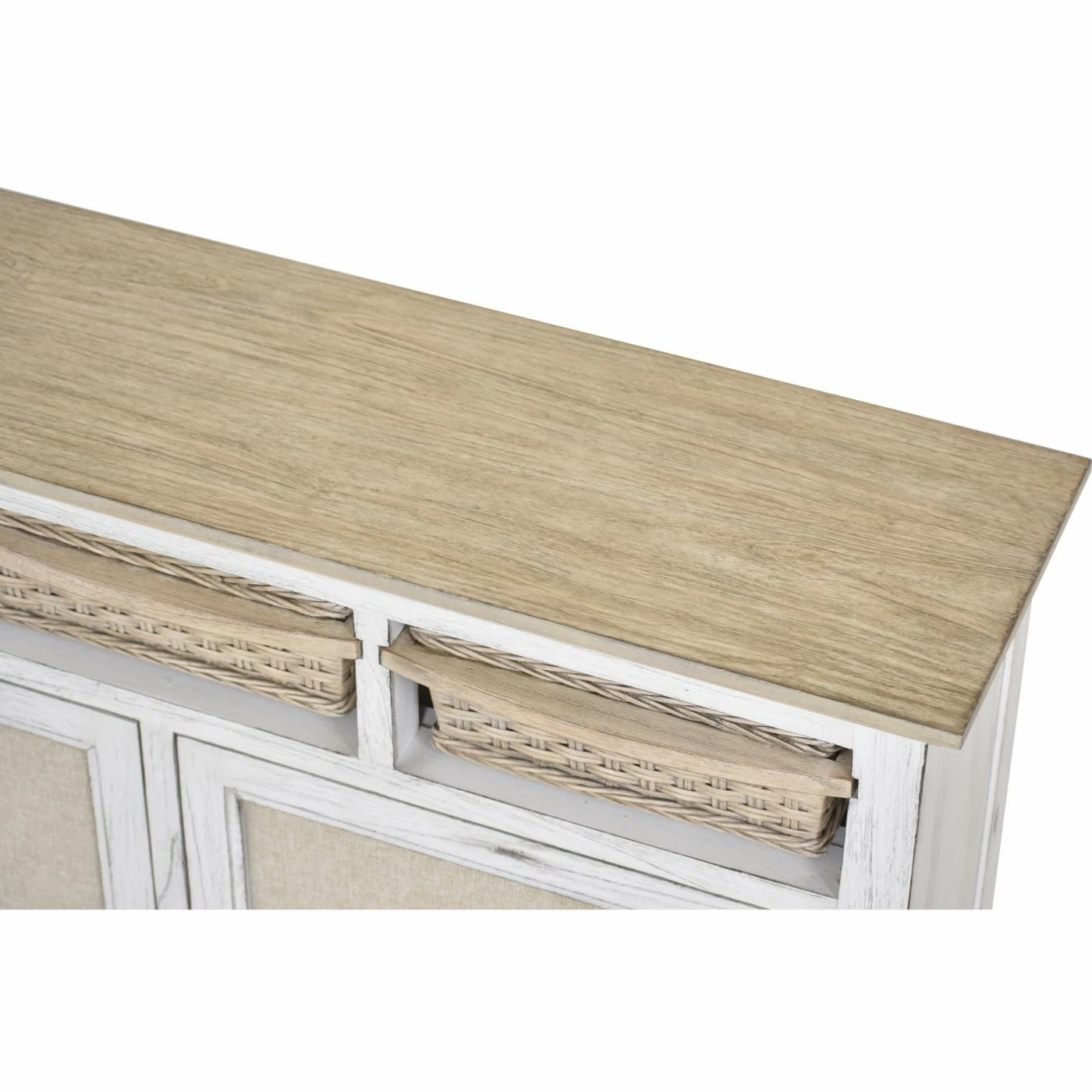 Show your guests and your family that you run a tight ship with the Sea Winds Captiva Island Entry Cabinet with Baskets. This slim cabinet is perfect for living rooms and entryways, or anywhere else you need a little bit of extra organization. Weathered white wood makes up most of this cabinet, but is complemented by the tan driftwood on the top. Three baskets with built-in notches act as stylish drawers, and two spacious cabinets close for a streamlined look. The Olefin fabric on the cabinet fronts is an eco-friendly, durable material that can stand up to the chaos of family life. Details like rope pull handles and woven wicker make styling this in your home a breeze. Some assembly required.