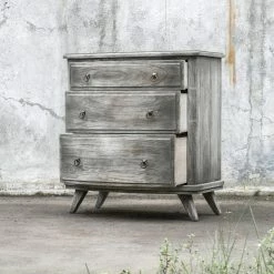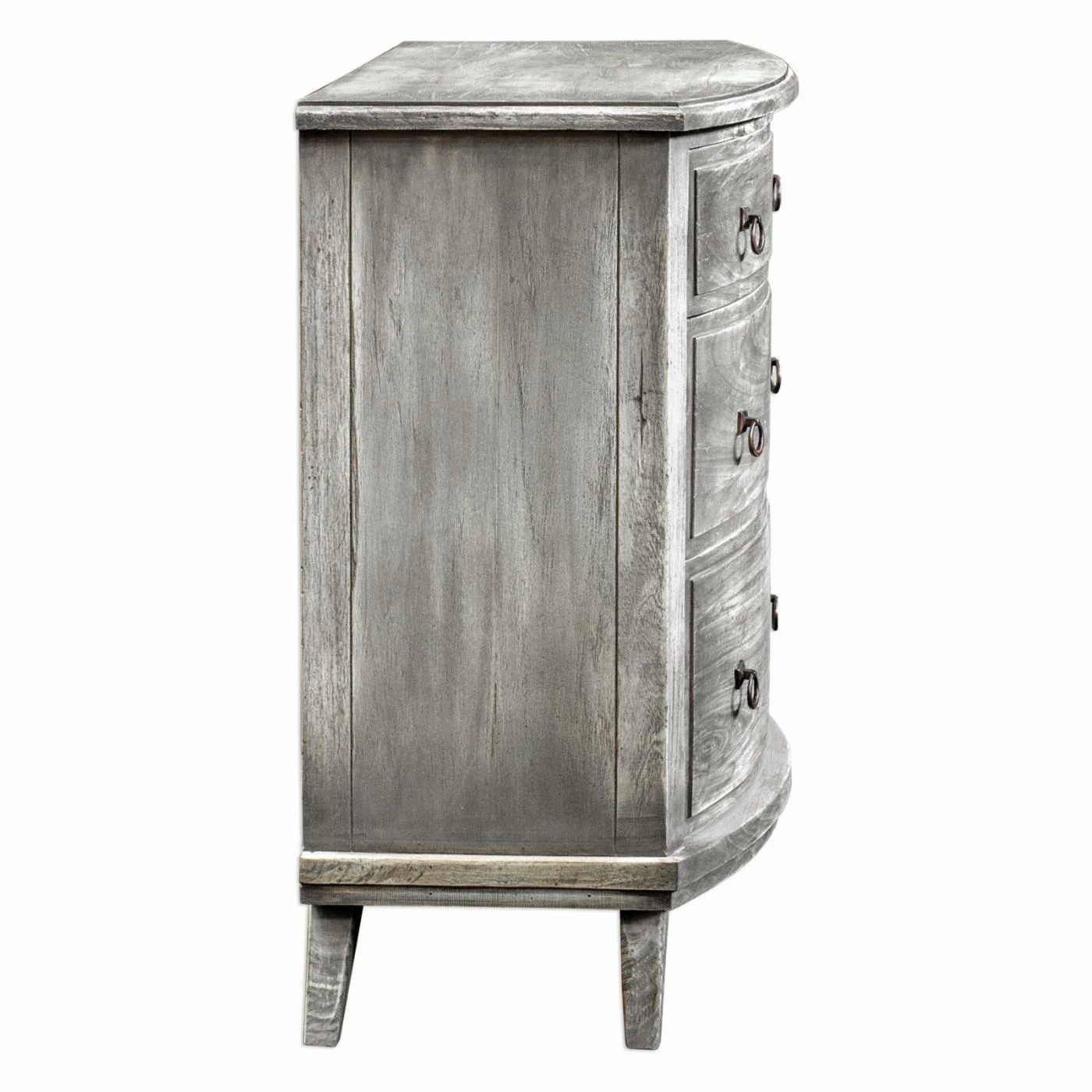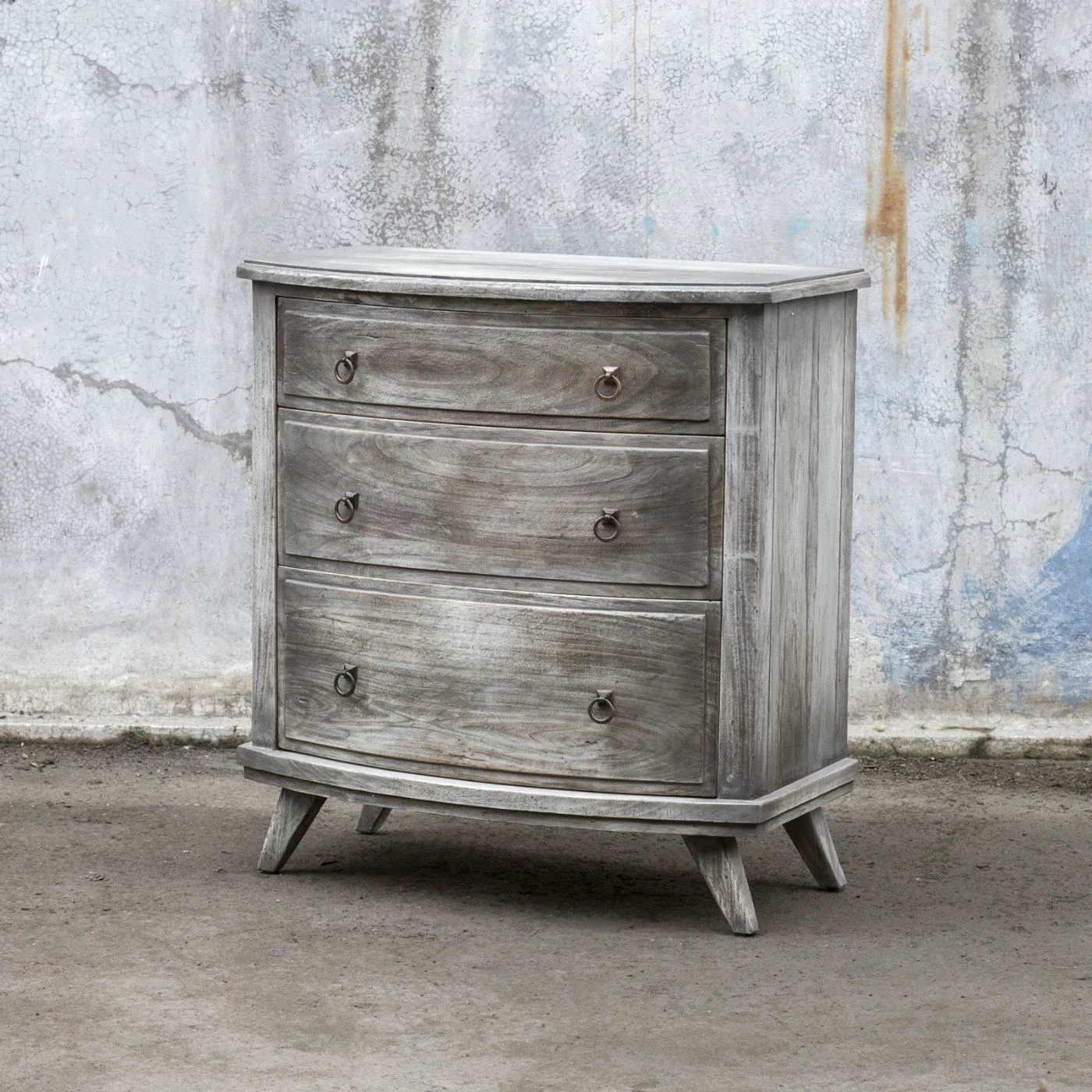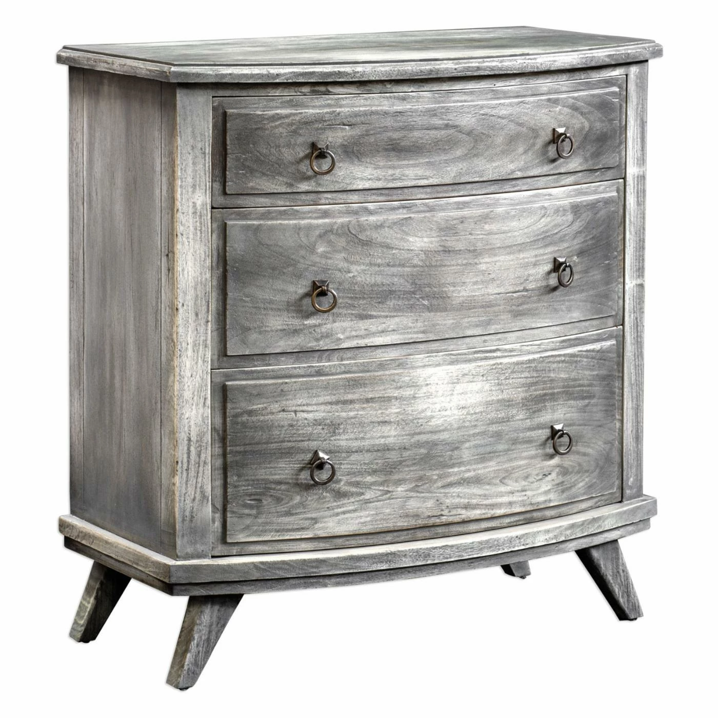Introduce some well-loved storage space into your guest room, office, or living room with the Uttermost Jacoby Driftwood Accent Chest. This chest has a classic mid-century style profile with splayed legs. Its frame is constructed from thick engineered wood and boasts a burnished driftwood finished that lends a weathered gray look. Three drawers are incorporated into the design, each featuring a raised front and antique bronze-finished metal ring pulls.