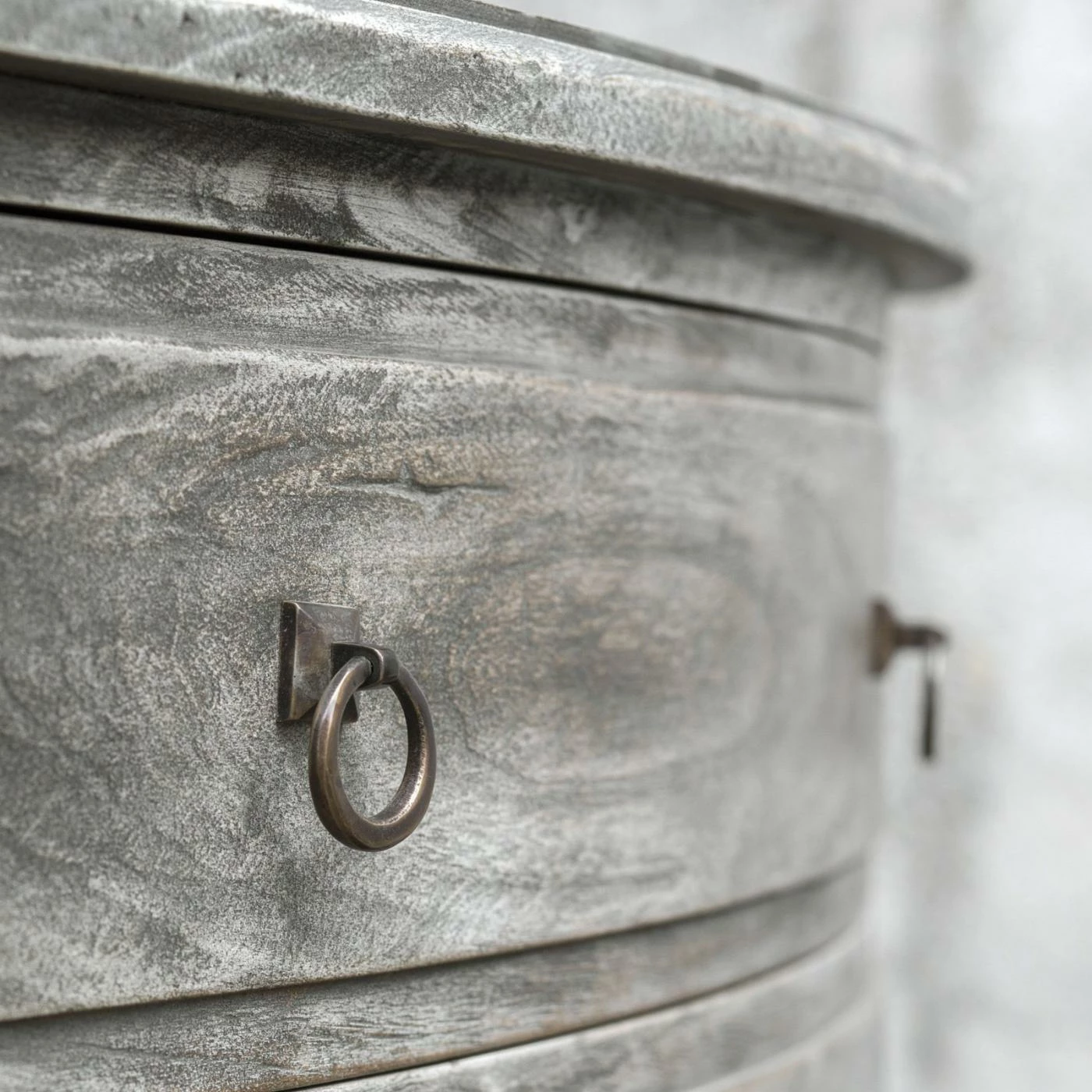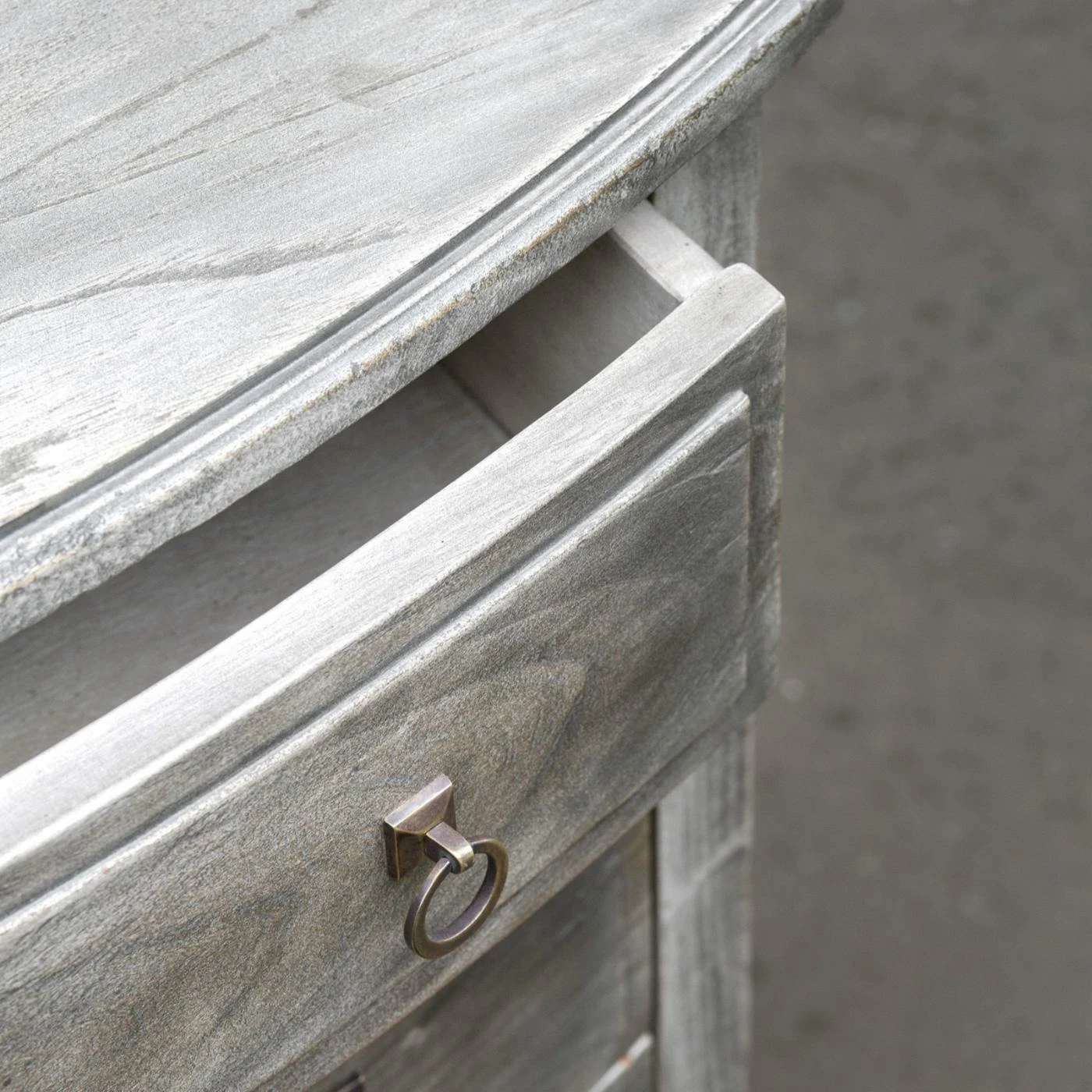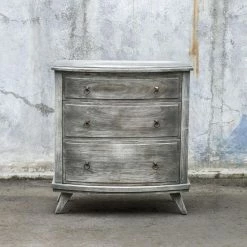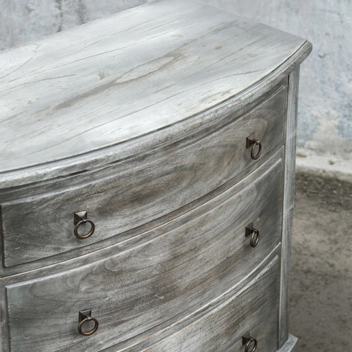 Introduce some well-loved storage space into your guest room, office, or living room with the Uttermost Jacoby Driftwood Accent Chest. This chest has a classic mid-century style profile with splayed legs. Its frame is constructed from thick engineered wood and boasts a burnished driftwood finished that lends a weathered gray look. Three drawers are incorporated into the design, each featuring a raised front and antique bronze-finished metal ring pulls.