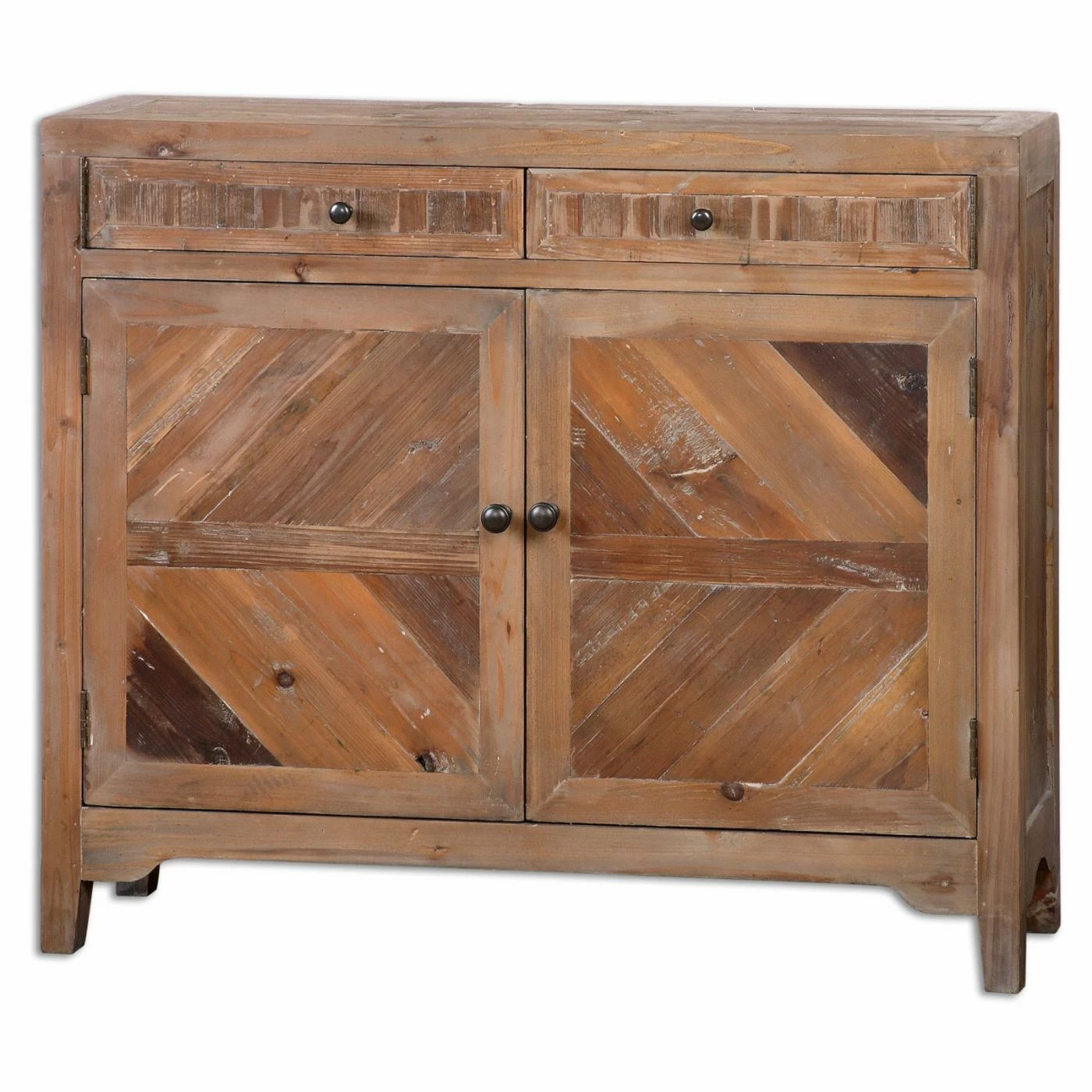 Eco-friendly and ultra stylish, the Hesperos Reclaimed Wood Console Cabinet was sustainably crafted from reclaimed fir wood. Sure to make a bold, artistic statement in your home, the front panels on this cabinet feature intricate piecing that layers colors and textures. Two swing-out drawers add stylish storage for flatware, table linens, and more. Twin French style cabinet doors open to reveal an interior shelf and ample storage space.