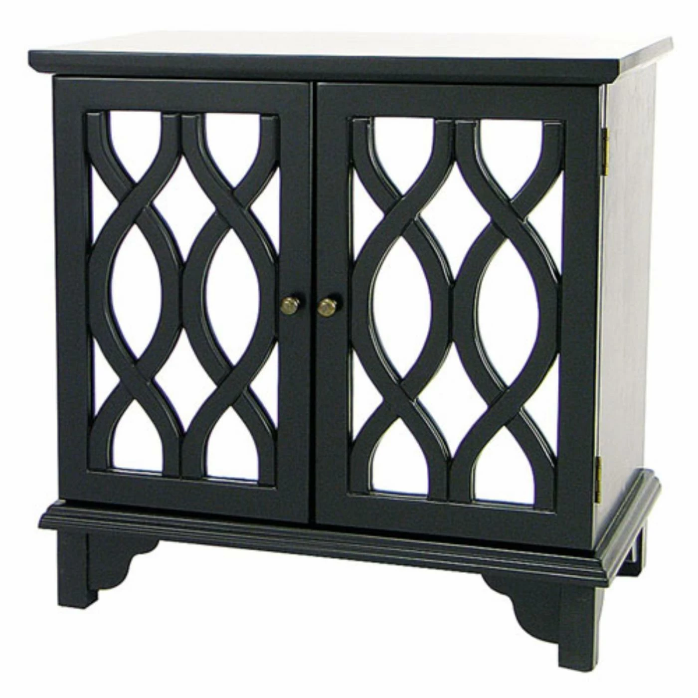 The Tanner Double Door Mirror Cabinet has beautifully mirrored door fronts with curving wood overlay. Inspired by the classic Art Deco look, this piece is the perfect accent to any home decor. The mirrored panels will enhance any setting with light, depth, and unique retro-modern style, while the undulating lines provide a calming sense of flow. This functional cabinet has two doors and adds an urban, contemporary feel to any room. The attractive design of the cabinet is sleek, modern, and stylish, and the mirror detail is timeless and special. Dimensions: 29W x 17D x 29H inches.
