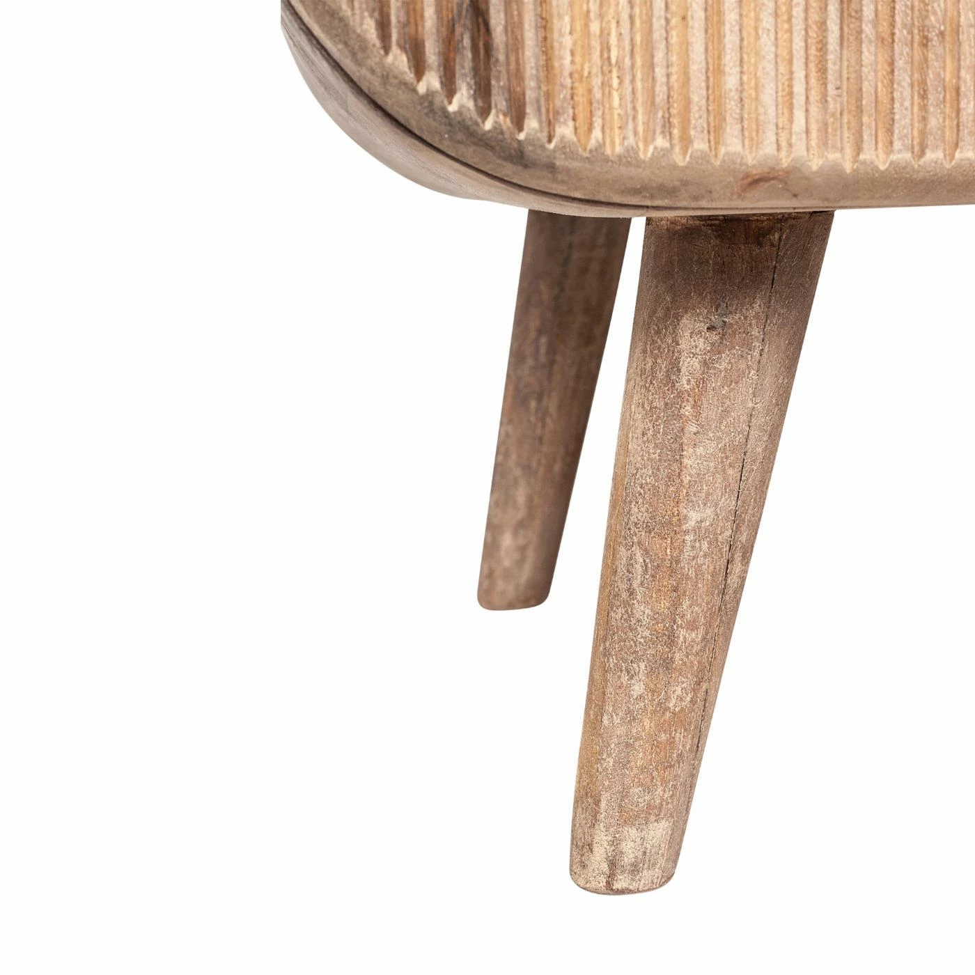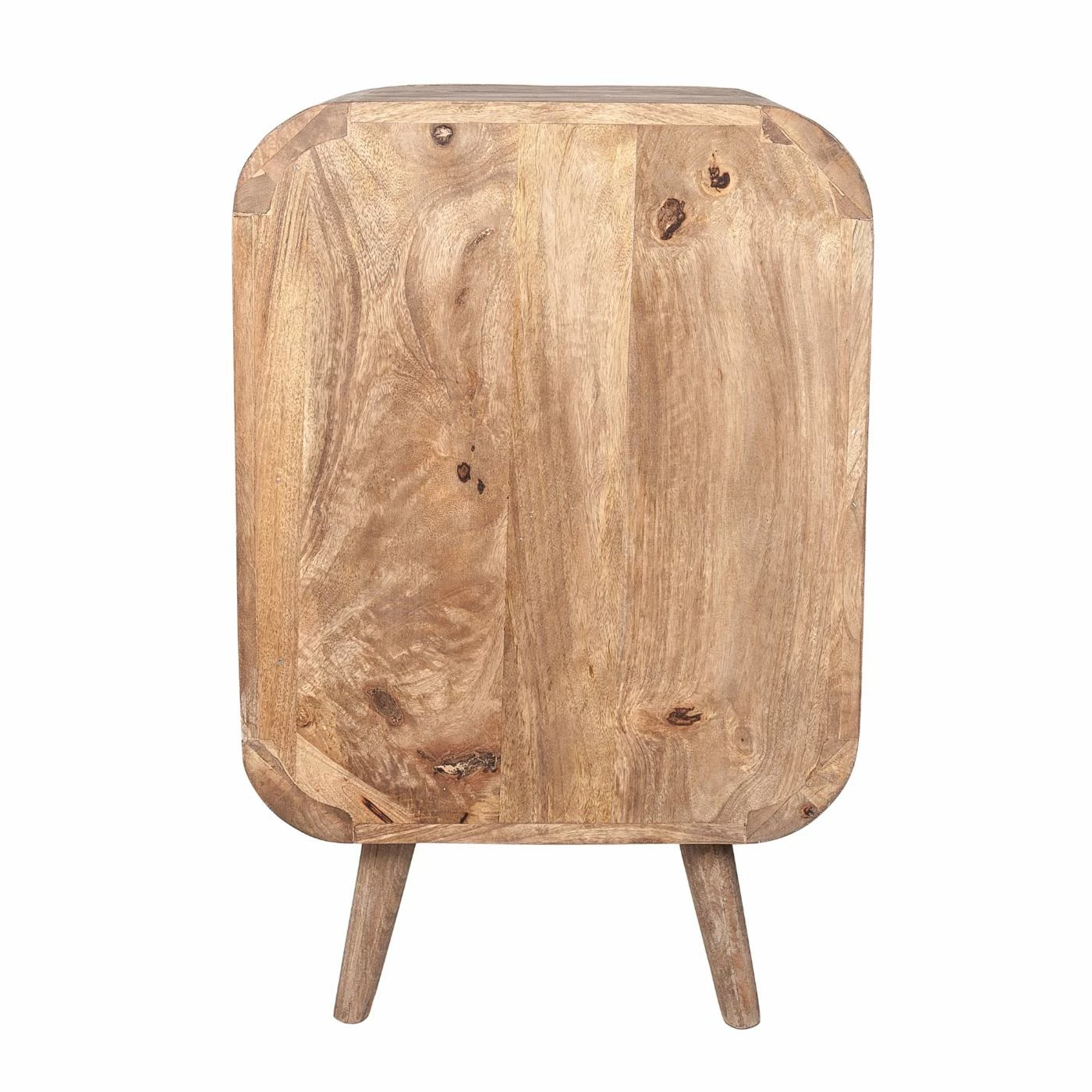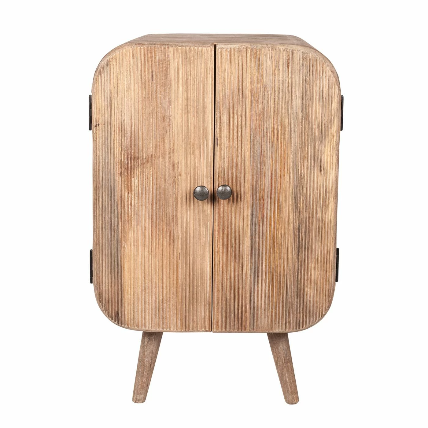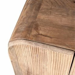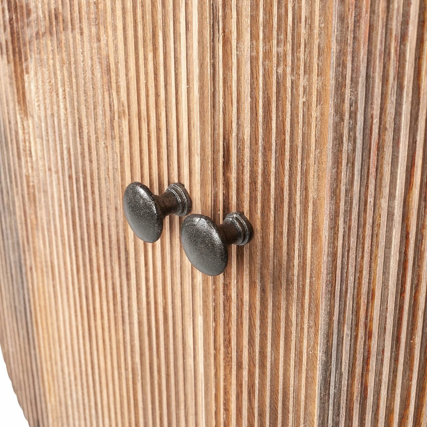 Modern mid-century details and rustic finishes combine in this playful accent cabinet. Striking a rounded rectangular silhouette, it’s made from solid mango wood with a neutral brown finish that shows off the wood’s grain color variation. Tapered, splayed legs add character down below while the vertical grooves add that must-have texture and visual intrigue. Inside the two doors, this accent cabinet has two storage shelves for added organization.