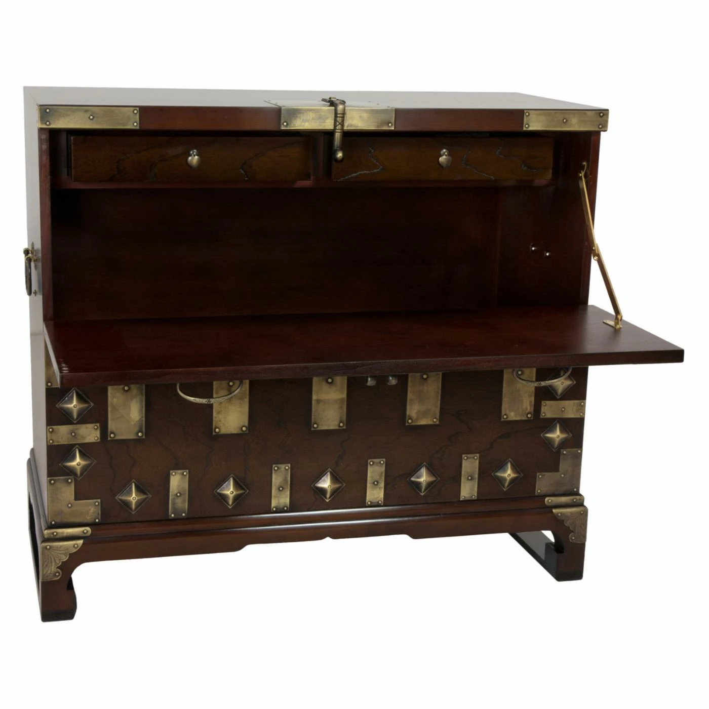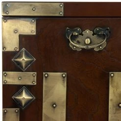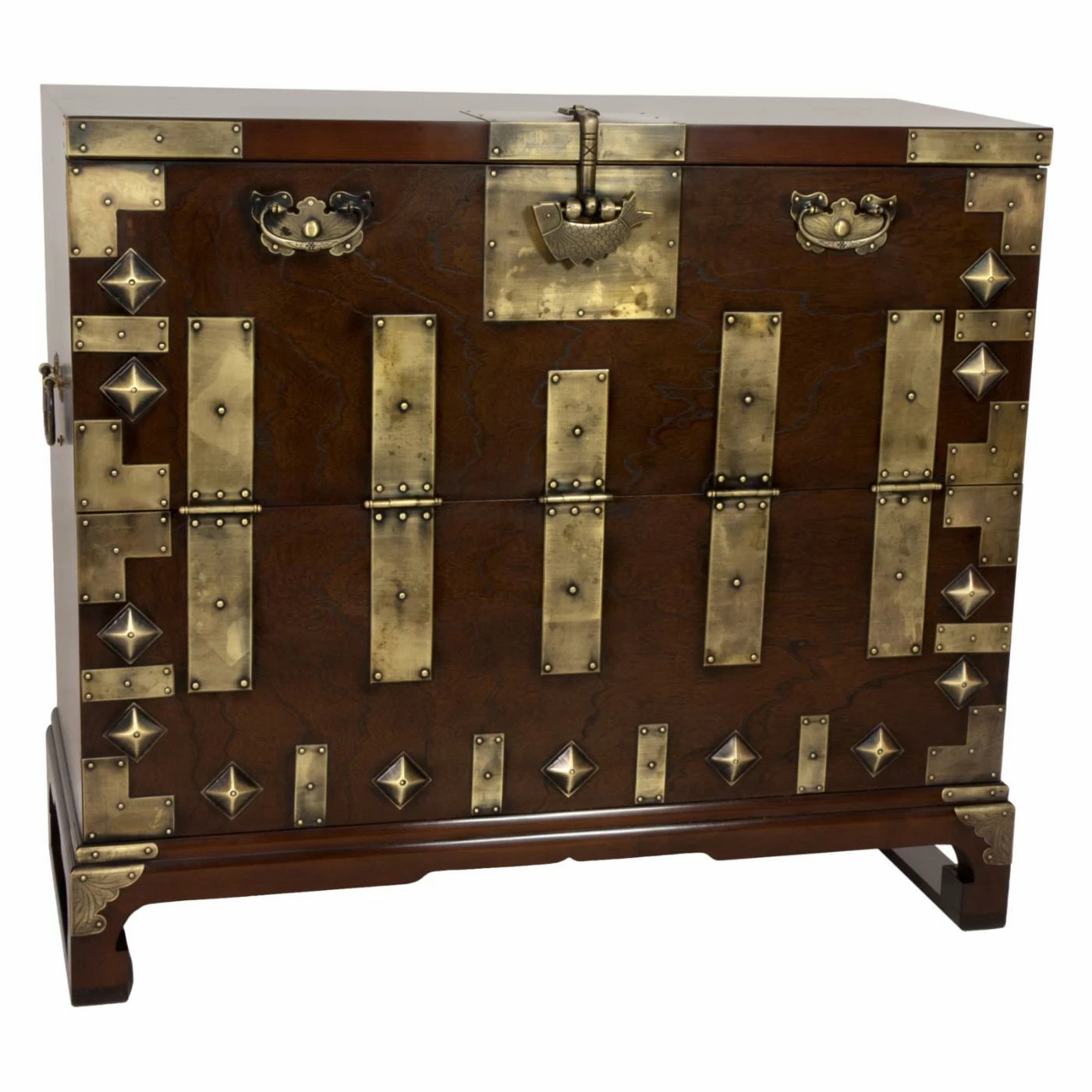 The heirloom Oriental Furniture Korean Bandaji 2 Drawer Blanket Chest is based on an authentic antique design. This drop-front blanket trunk is handcrafted of richly grained elm using traditional Asian joinery and cabinetry. Its dark stain highlights the brass accents beautifully. This conversation chest features etched Oriental brass hasps, hinges, and fittings. It includes a lucky brass fish lock and key. This far eastern chest features two drawers tucked inside, making it ideal for storing linens. It’s equally as striking as an end table, nightstand, or lamp table in the living room, bedroom, or home office.