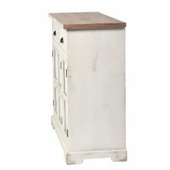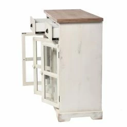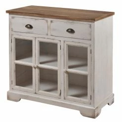 Behind glass doors, the StyleCraft Shabby Chic 3 Door 2 Drawer Window Pane Accent Cabinet will display sought-after antiques and family heirlooms. This cabinet is constructed of wood, and it features distressed off-white and natural finishes. Two drawers open and close with brass-finished cup pulls. The glass doors feature a window pane overlay and simple, round pulls. This accent cabinet is perfect for farmhouse or rustic spaces.